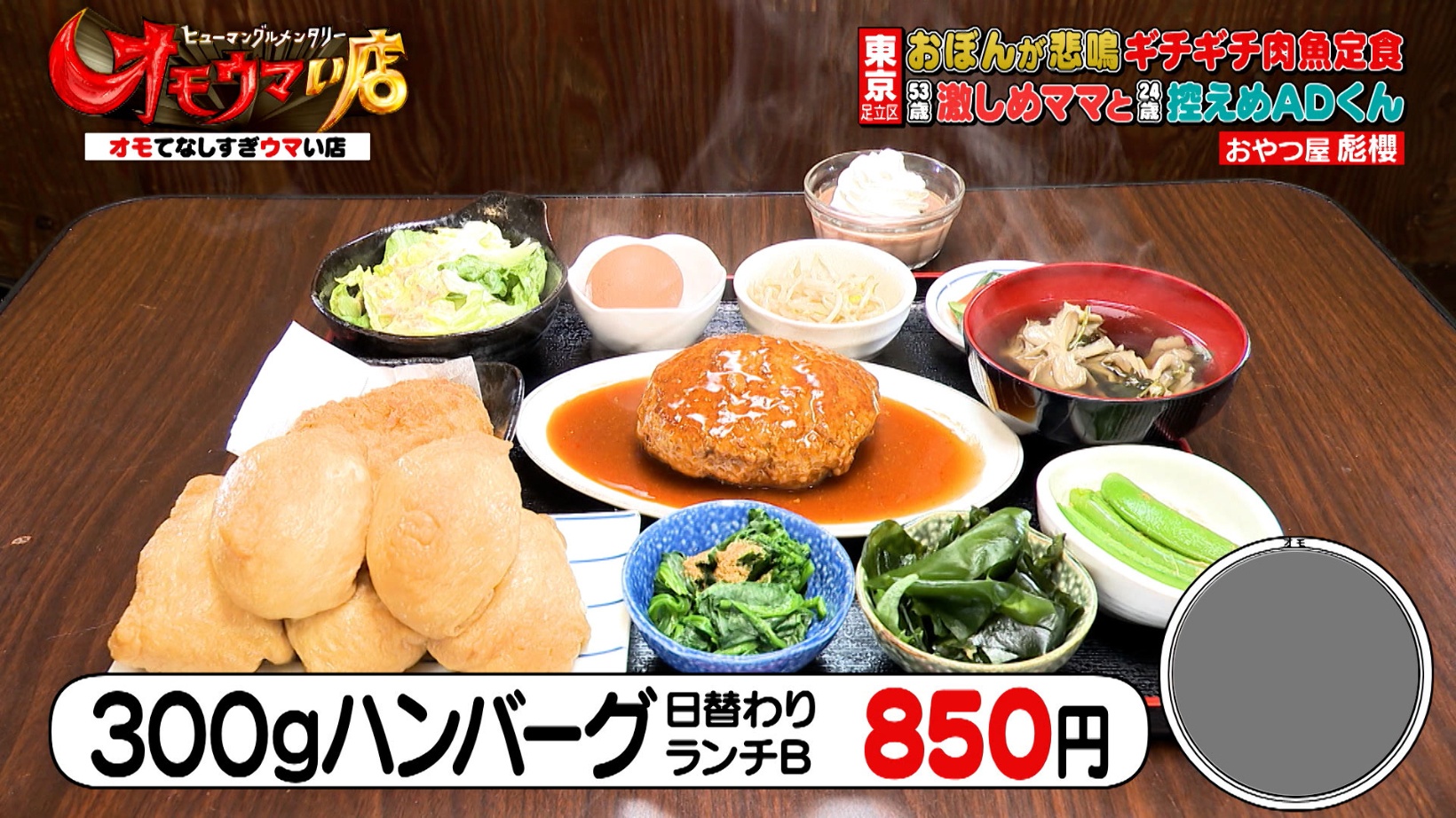地元で愛される定食屋『おやつ屋 彪櫻』の名物は、大量の小鉢がついた日替わりランチ。ハンバーグといなり寿司が楽しめる「300gハンバーグ(850円)」は、大量の小鉢がついて850円という安さ!
