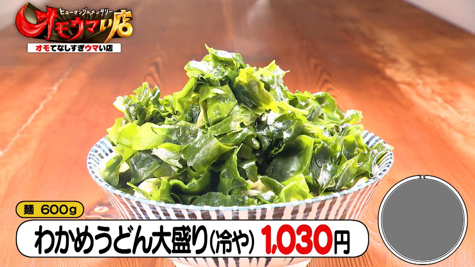 麺600gと自家製つゆが入った「わかめうどん大盛り(冷や・1,030円)」。たっぷりトッピングされたわかめの量に、スタジオから「こんなに!?」と驚きの声が上がります。