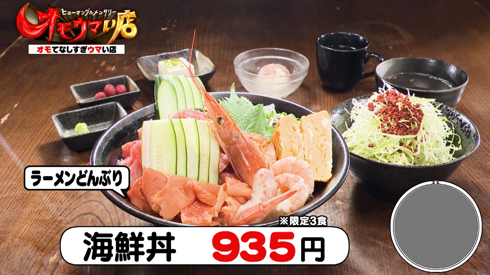 本マグロや黒ミル貝、炙りしめサバ、フグの皮、あん肝などが盛られた「海鮮丼(限定3食)」。ラーメンどんぶりを器に使い、ボリューム満点なのに935円という安さです。