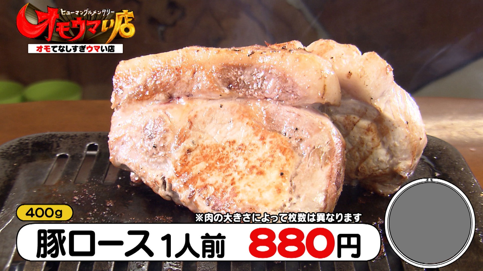 岩石のように直立する「豚ロース 1人前(880円)」は、一般的なサイズの約33枚分のボリューム。国産ブランド豚を使っているとは思えない安さに、スタジオメンバーは驚愕します。