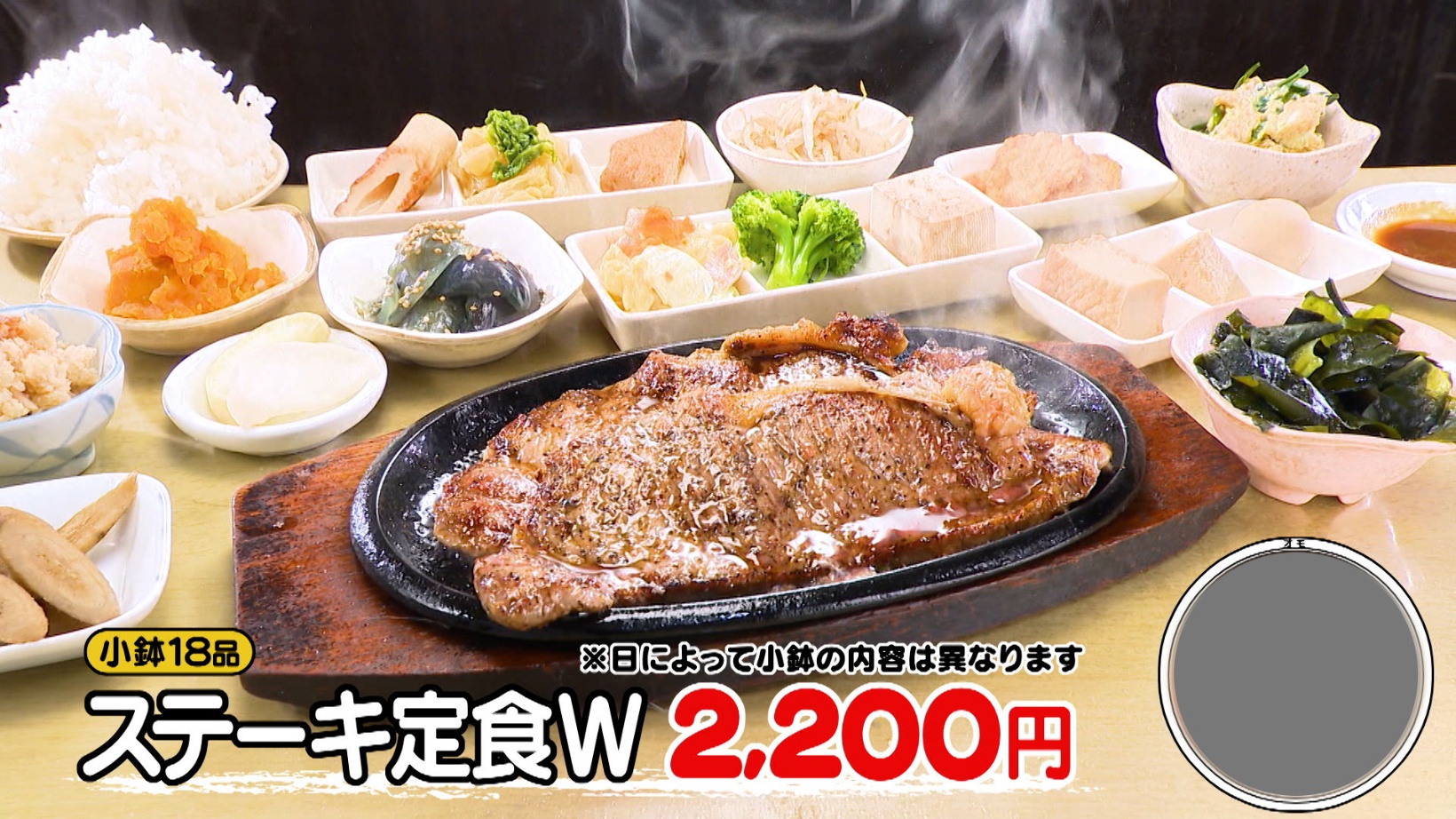 そして、ステーキ2枚の「ステーキ定食W(2,200円)」は、小鉢の量も2倍に。テーブルの上を隙間なく小鉢が埋め尽くす様子に、スタジオからは「これスゴイよ!」と驚きの声が上がります。