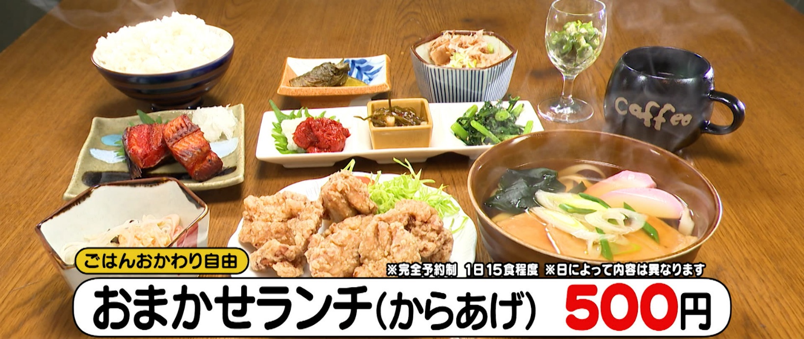 「おまかせランチ(からあげ)」は、メインのからあげに加え、春菊のおひたし、つぶ貝と昆布のあえ物、春雨サラダなど全12品。ごはんのおかわり自由で、500円というびっくり価格です!
