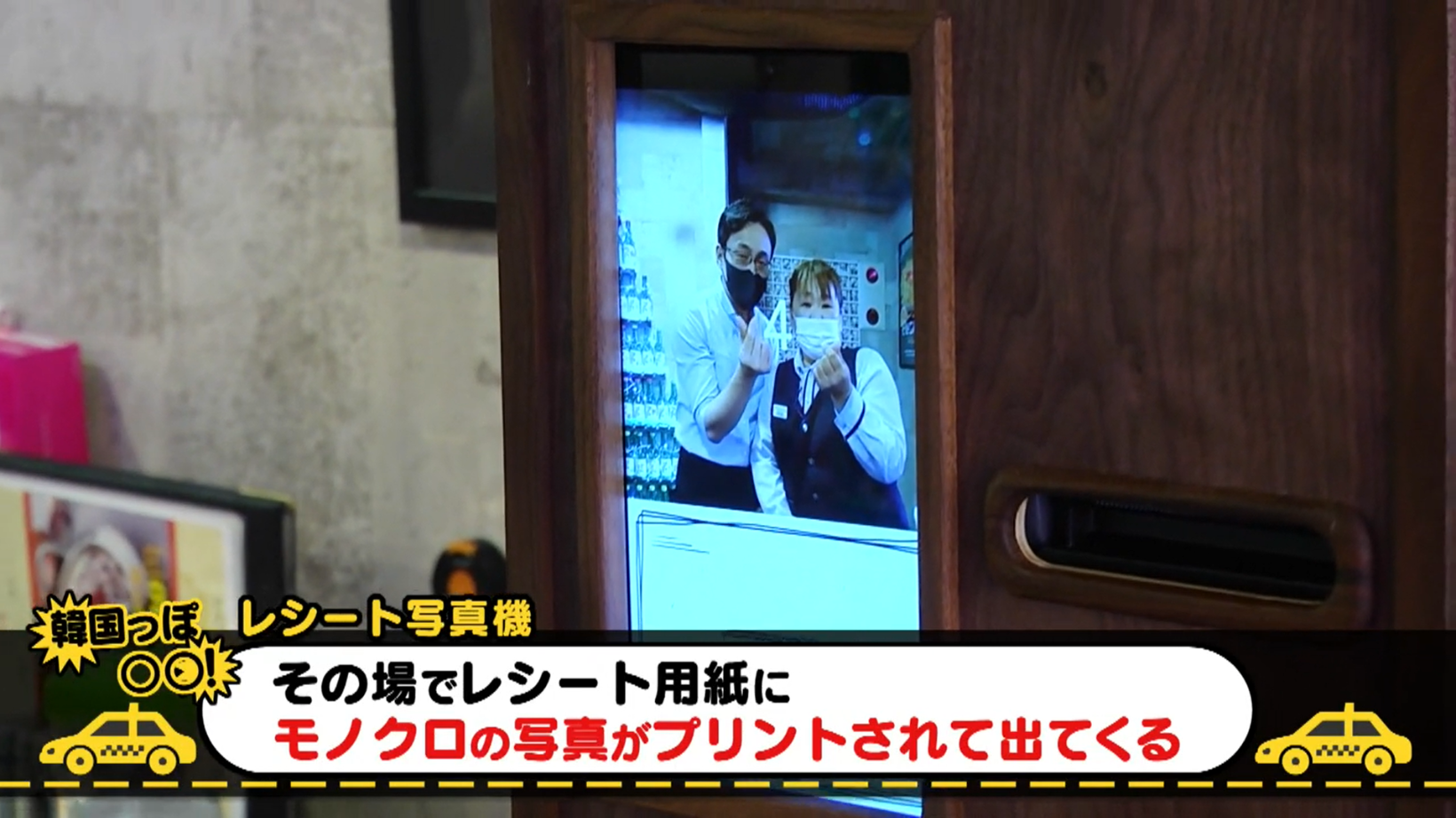 また店内には、韓国でトレンドとなっている「レシート写真機」も!「レシート写真機」とは、その場でレシート用紙にモノクロの写真がプリントされて出てくる機械。画面をタッチするだけで、誰でも気軽に記念写真を撮ることができます。動画では、フォトスポットにもなっている“韓国の焼酎瓶タワー”やネオンが彩る壁面など、“韓国らしさ”が漂う店内の様子もピックアップ。