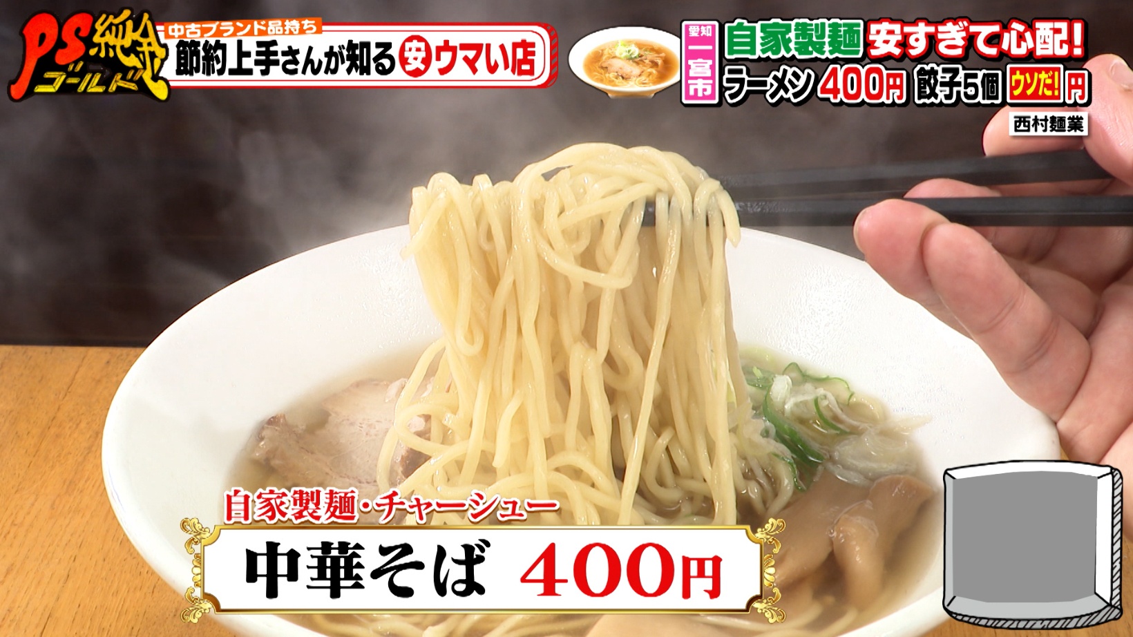 「中華そば(400円)」は自家製麵を使い、チャーシュー付きでこの価格。「焼きそば(400円)」は、卓上の特製ソースを自分であとがけするスタイルで、麺の独特な食感が魅力です。ゲストの磯山さやかさんも思わず「安っ!」とコメントします。