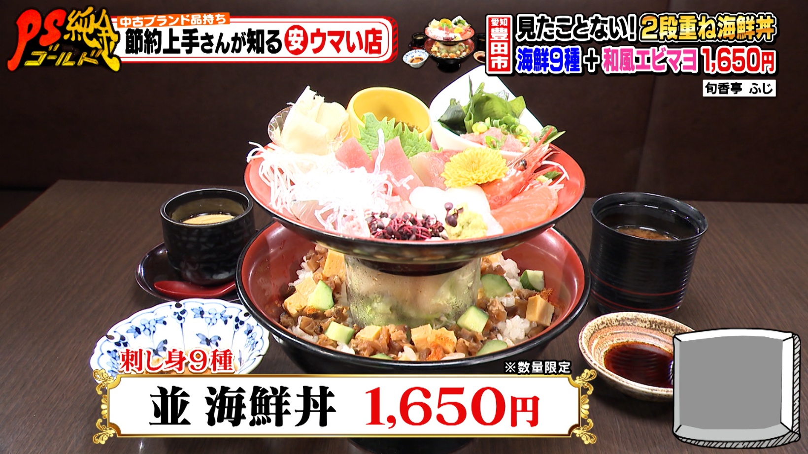 ランチの「並 海鮮丼」は2段重ねで、上段が9種類の刺し身盛り合わせ、下段がちらし寿司です。つなぎ部分の透明ケースにも、一品料理(和風エビマヨ)がしっかり盛られています。値段はなんと1,650円。あまりのお得さにスタジオの高田さんも「うそでしょ!?」と驚きを隠せません。