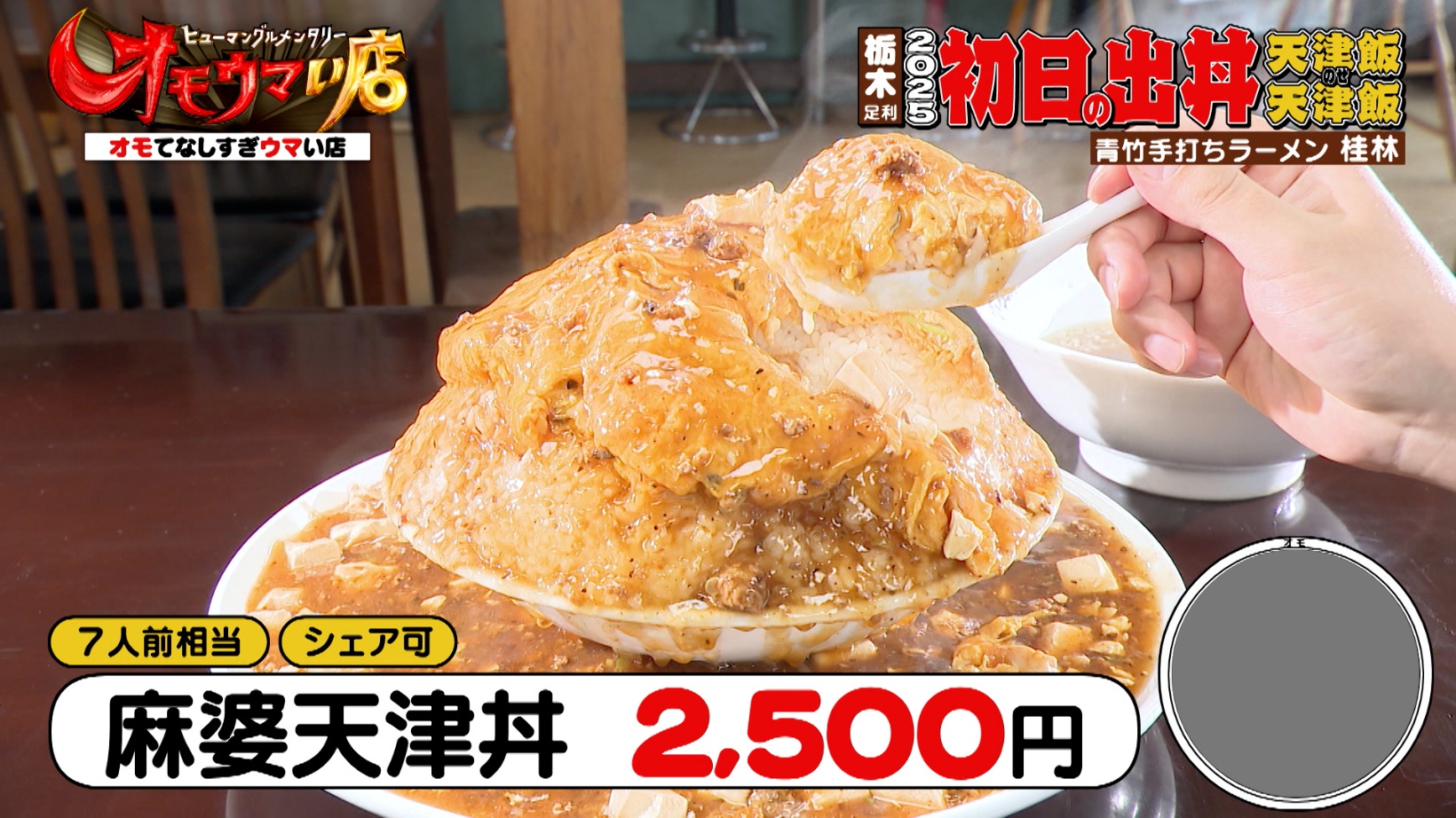 丼ぶりから麻婆があふれ下の器と2段重ねで提供される「麻婆天津丼(2,500円)」が登場すると、スタジオから「何これ!?」「見たことない!」と驚きの声が上がります。