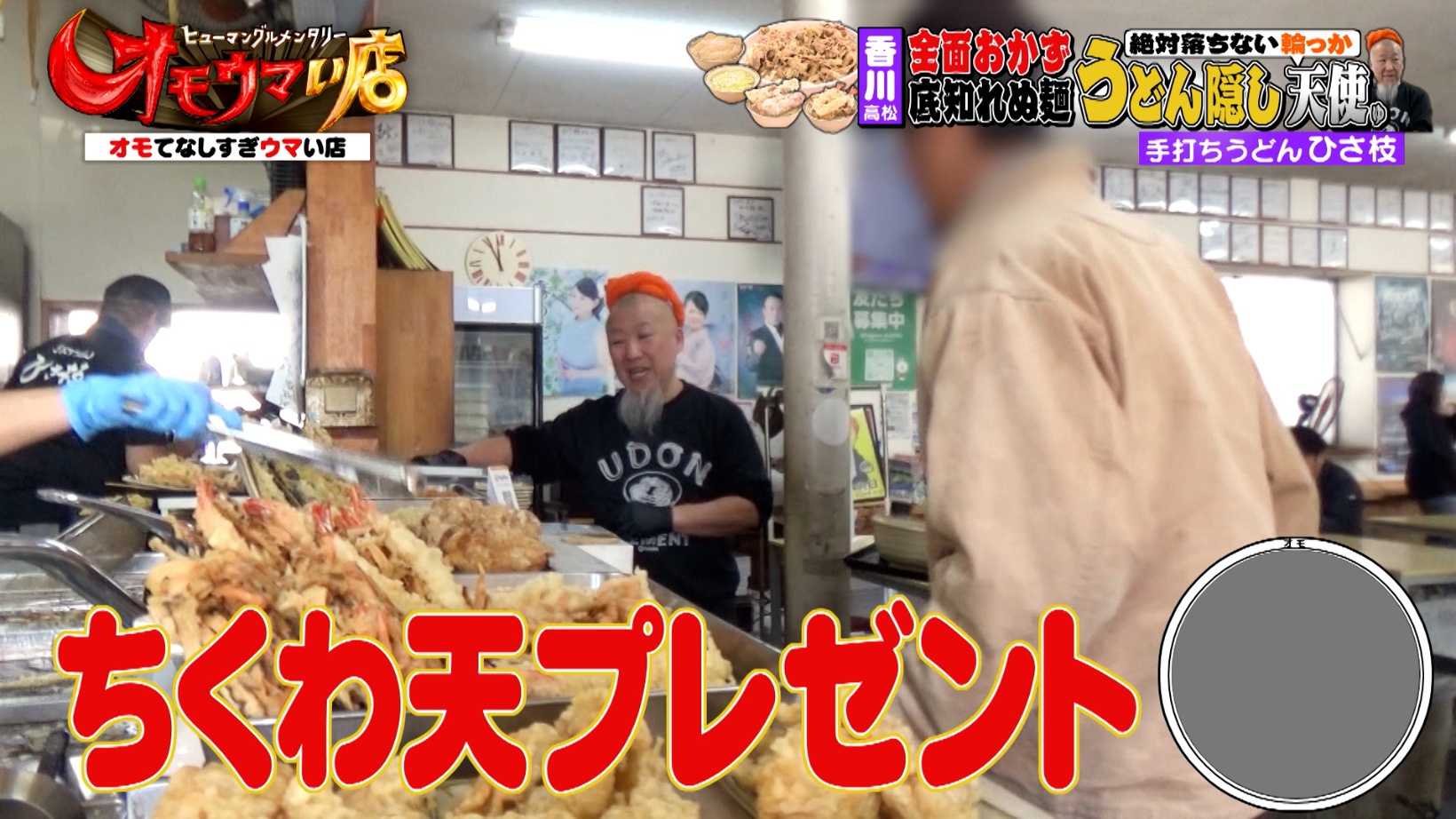 うどんが見えないほど具材を盛るのが店主のこだわり。「うどんを見せない」「見せたらダメ。ハレンチ」という発言が繰り出され、スタジオからは笑いが起こるのでした。