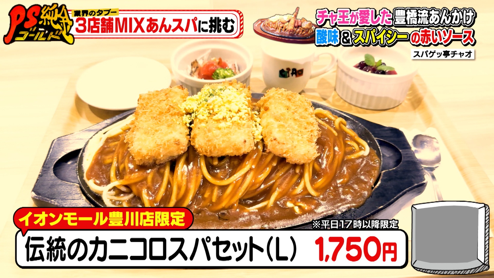 「チャ王」はイオンモール豊川店限定の「伝統のカニコロスパセット(L)(1,750円)」を食し、手作りのカニクリームコロッケ、タルタルソース、あんかけを絡めて食べる至福を堪能。「スパイシーさと甘みが、なんとも言えないハーモニー」と味を伝えてくれたのでした。