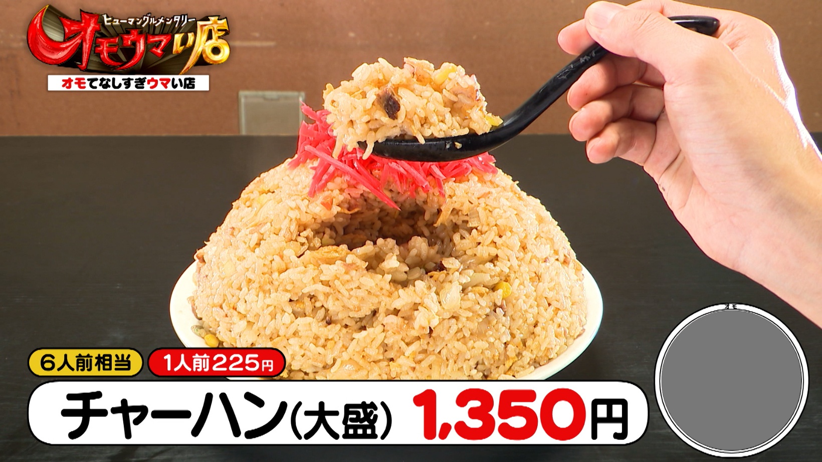 てんこ盛りの「チャーハン(大盛・1,350円)」が映し出されると、スタジオから「マンガだよな」と驚きの声が上がります。お米は新潟県産「こしいぶき」を約3合使用し、なんと6人前相当のボリュームです。