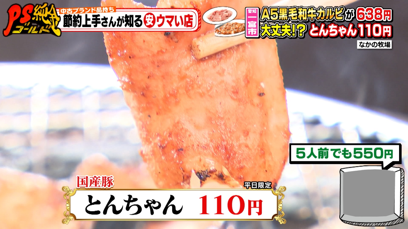 夜は上質な焼き肉店ですが、うれしい価格のメニューも用意。A5黒毛和牛の「牧場カルビ(638円)」、さらには特製味噌で味付けした国産豚「とんちゃん」が「平日限定で110円」と衝撃価格です! スタジオの高田さんは思わずイスからズッコケてしまったのでした。