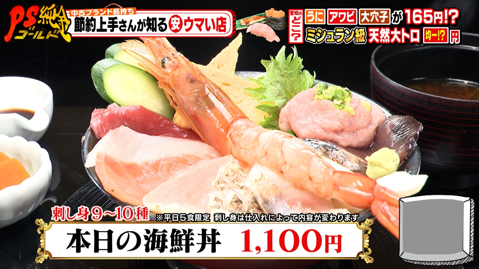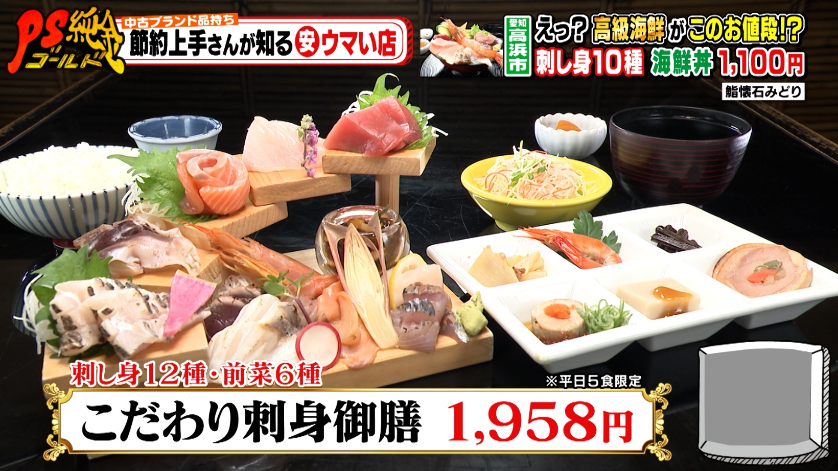 刺し身12種と季節の前菜6品が優雅に盛られた「こだわり刺身御膳(1,958円)」には、「安い!」とスタジオメンバーも目を見張ります。でも、これで驚いちゃいけません。実は、真の節約上手さんだけが知る、併設の寿司店があるのだとか!