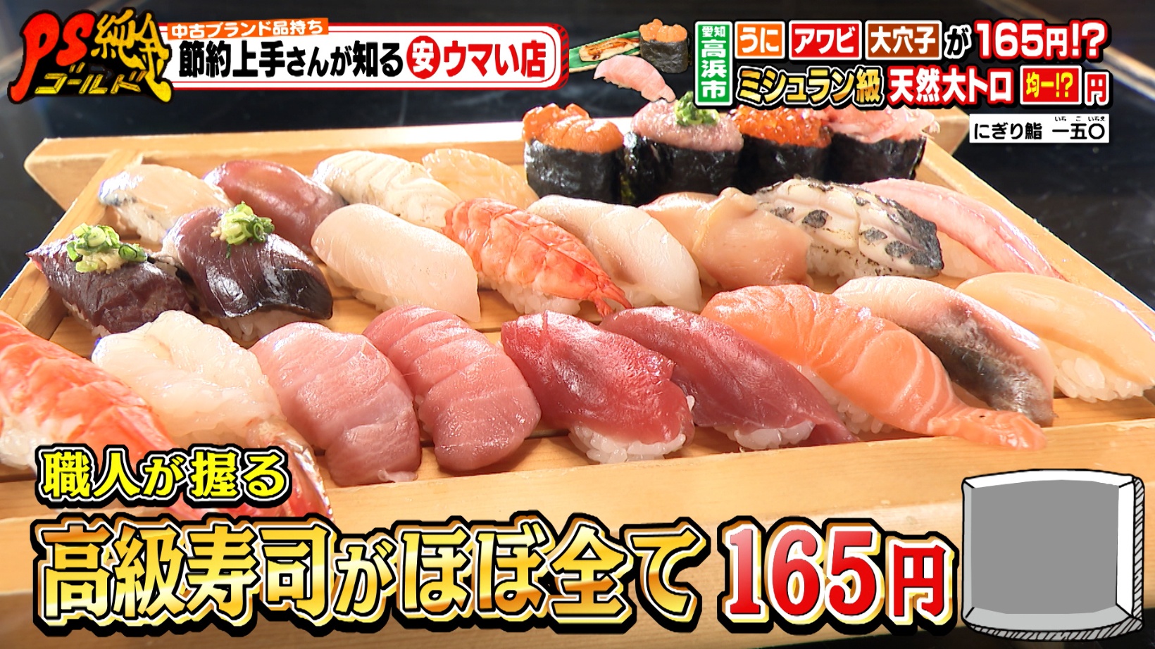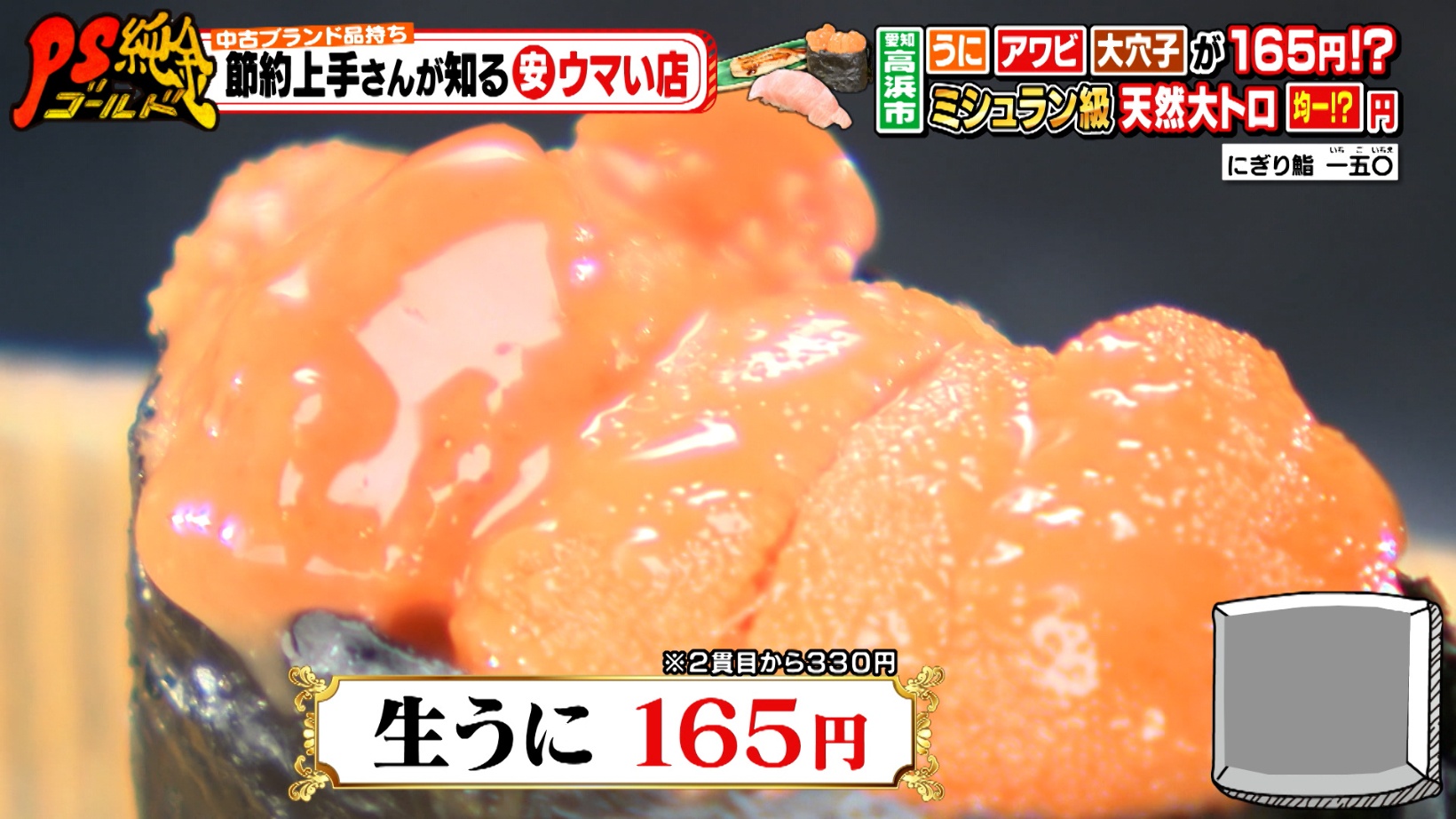 「大穴子(165円)」「ズワイガニ(165円)」「どっさりイクラ包み(165円)」「生うに(165円、2貫目から330円)」「アワビ(165円、2貫目から330円)」という驚愕の価格のオンパレードに、スタジオメンバーは「ウソだ!」と大興奮。
