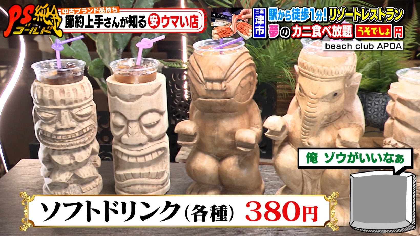 アートな木彫り容器で「ソフトドリンク(各種 380円)」が届く様子には、スタジオメンバーは大爆笑。これも「合理的なことばっかやったら、非現実にならへんとちゃう?」というAPOAの浜田社長の考えから。