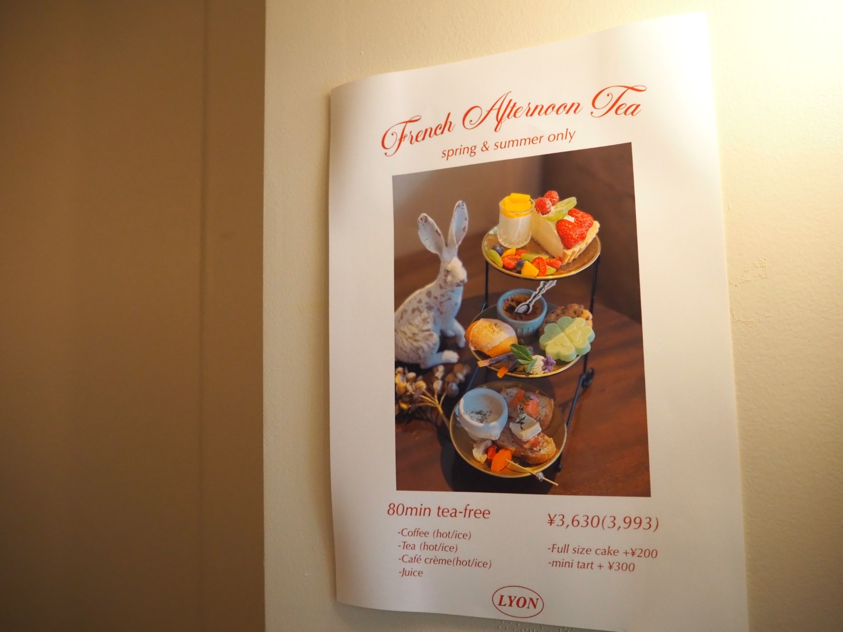 Café de Lyonオーナー・岸本さんいわく、「フランスをそのまま日本に持ってきたようなお店をつくりたい」というこだわりのもと、メニュー、壁の色、食器などすべてにこだわったという『リオン菓子店』。