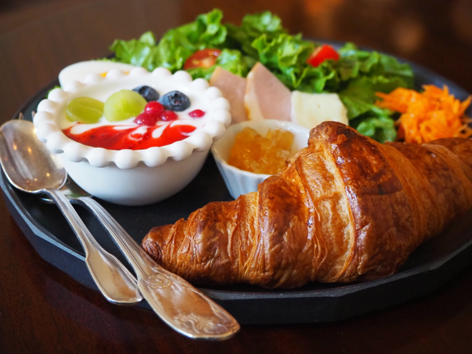 フランスで実際に食べられている朝食を再現したメニューで、生のフルーツヨーグルトや自家製ジャム、鳥取県のブランドハム「大山ハム」など多彩な味を楽しむことができます。