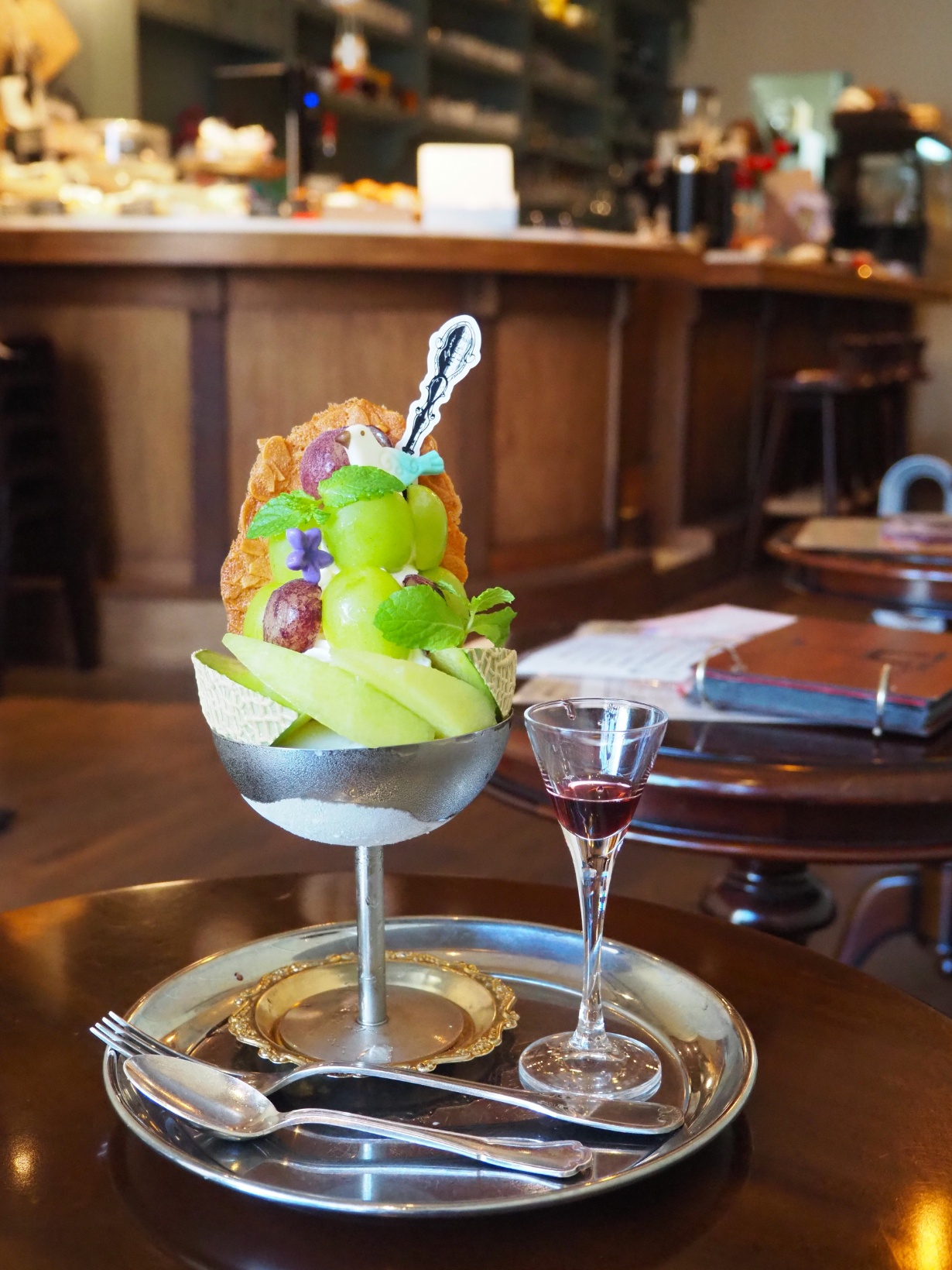 器やカトラリーは、フランスの蚤の市で買い付けてきたもの。繊細で美しい模様が、パフェの美しさを底上げします。