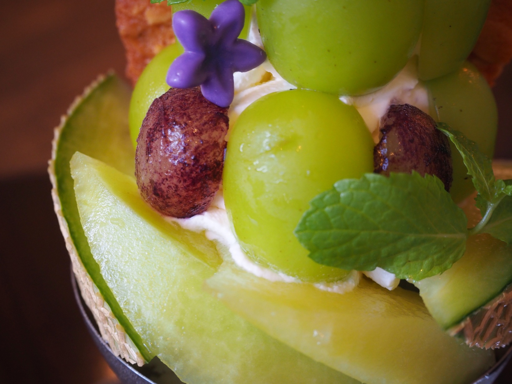 そんな想いが詰まったパフェのひとつが、クラウンメロンやシャインマスカット、巨峰を堪能できる「fleurs d’été (夏の花のようなパフェ)」(2,178円)。