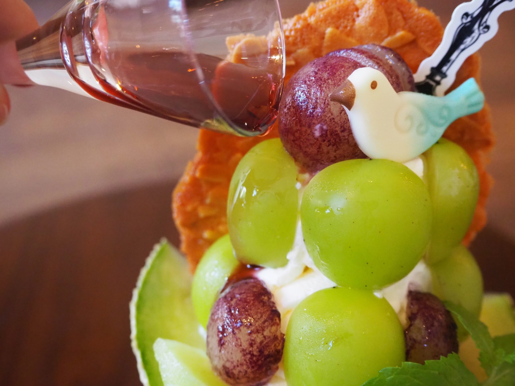 また、すべてのパフェメニューに自家製ソースを、“味変アイテム”として提供。fleurs d’étéに添えられていたのは、巨峰のシロップ。巨峰の甘酸っぱい酸味が、メロンのまろやかな甘さを引き立て、味わいに奥行きをプラスしていました。