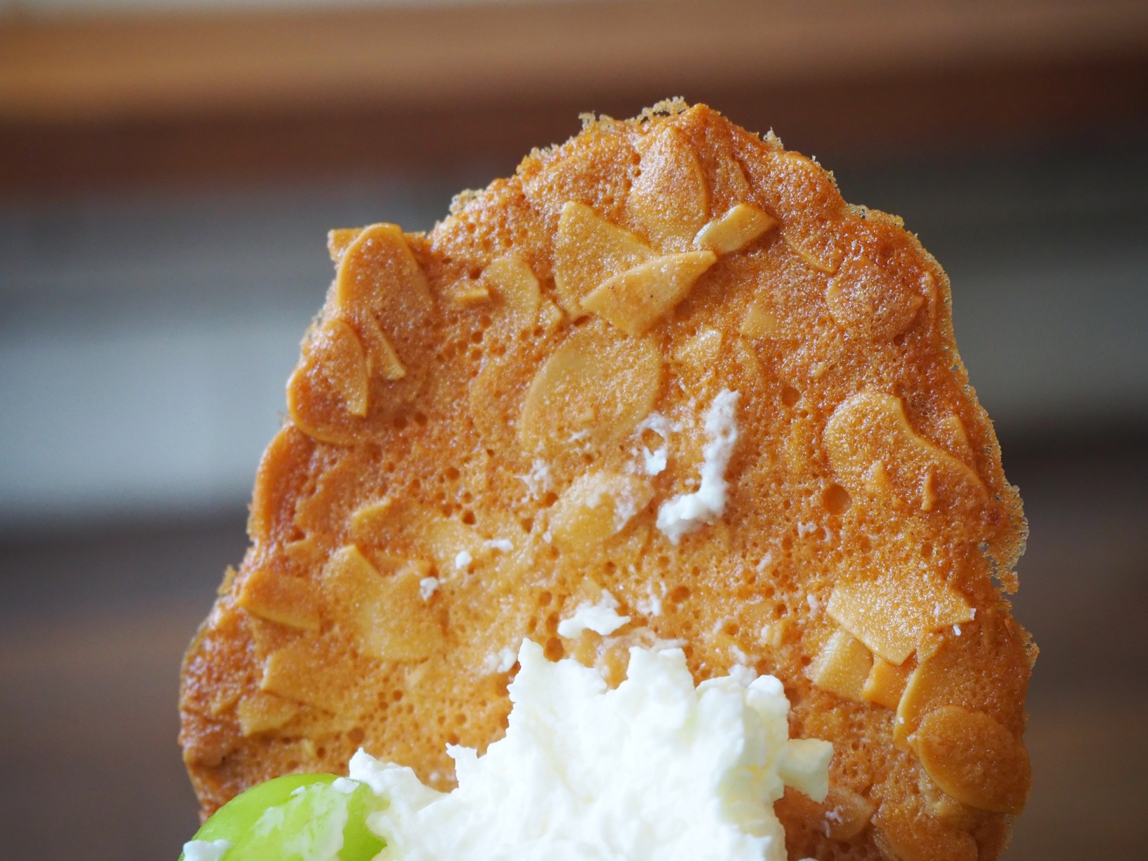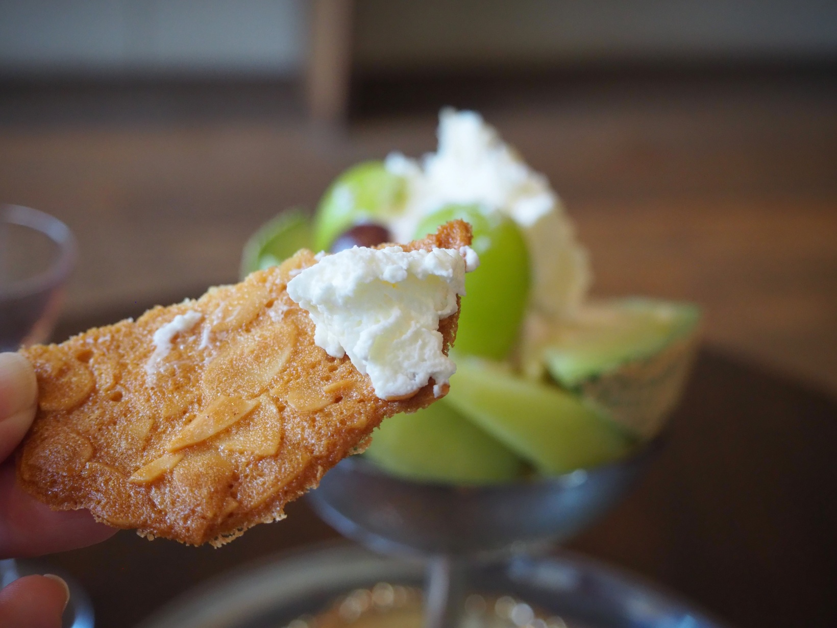 パフェにそっと添えられた、薄焼きクッキー「チュイル」も隠れた人気者。オーナー・岸本さん曰く、「ちょうどいい薄さと堅さ、カーブを求めて、100回くらい試作した」というこだわりのもと誕生した焼き菓子で、香ばしく、パリッとした食感がアクセントです。