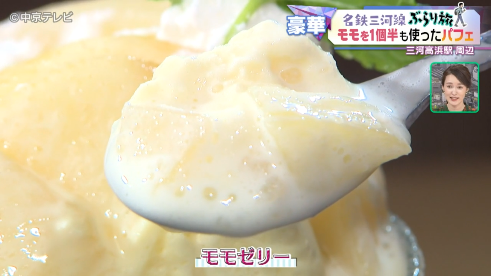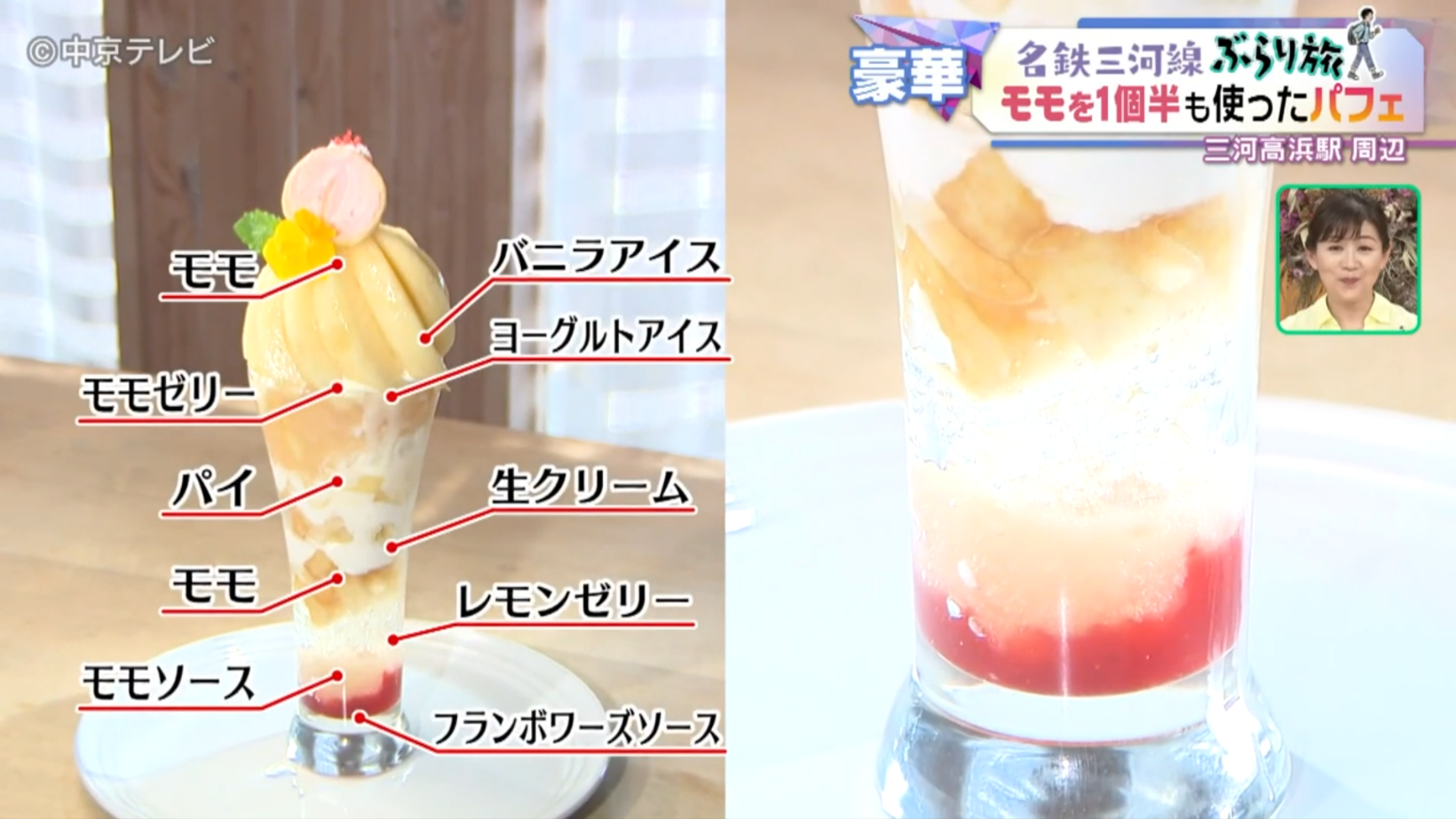 上山アナがオーダーしたのは、「ももパフェ」。同店オーナーによると、なんと三河産のモモを1個半使用しているといいます。