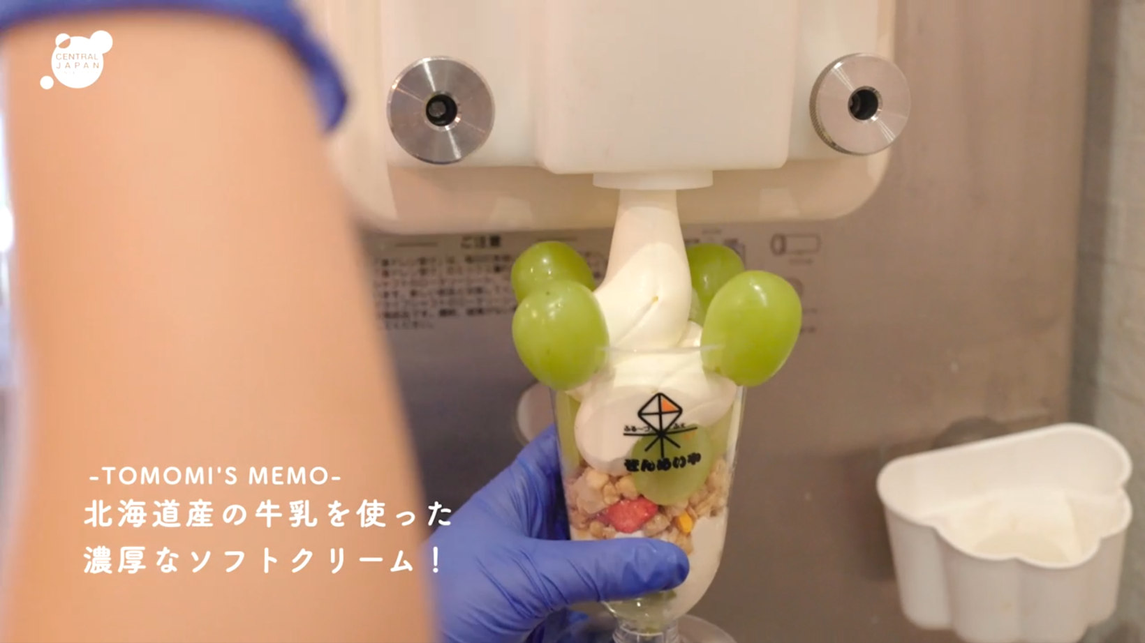 準備が整ったら、シャインマスカットをさまざまな形で盛り付け。カットしたマスカットをカップの中やふちにトッピングしたら、北海道産の牛乳を使用した濃厚なソフトクリームをたっぷり入れていきます。