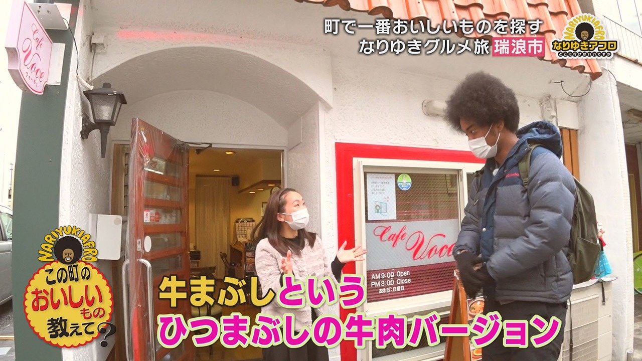 おいしいものを求め、町を歩いていると、工事をしている喫茶店を見つけた副島くん。そこにいたソプラノ歌手をしているという女性に瑞浪市のおいしいものを聞いたところ教えてくれたのは、『“牛まぶし”という、ひつまぶしの牛肉バージョン』。