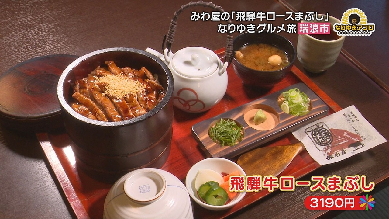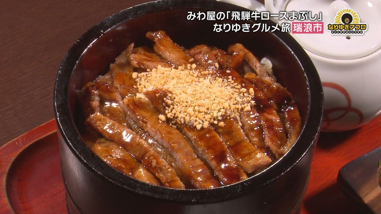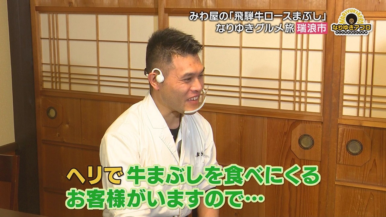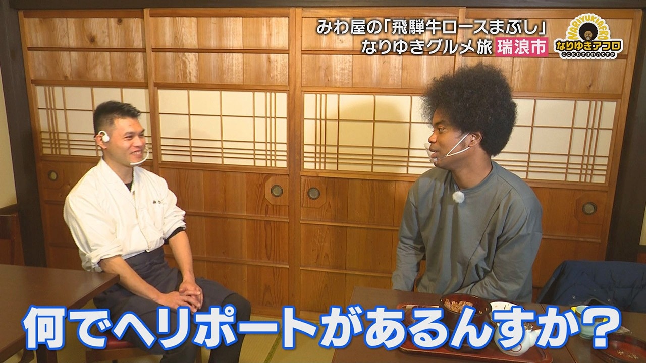 これを聞いて、すぐさま「う~、ヤバい!」と反応した副島くん。「飛騨牛なので、すごく脂の旨みが強いんですけど、お肉を食べるとライスが欲しくなるじゃないですか。それを全て叶えてくれる感じ」と女性が語る『飛騨牛のひつまぶし』。なんでも、ヘリポートも完備している【みわ屋本店】というお店だとか。