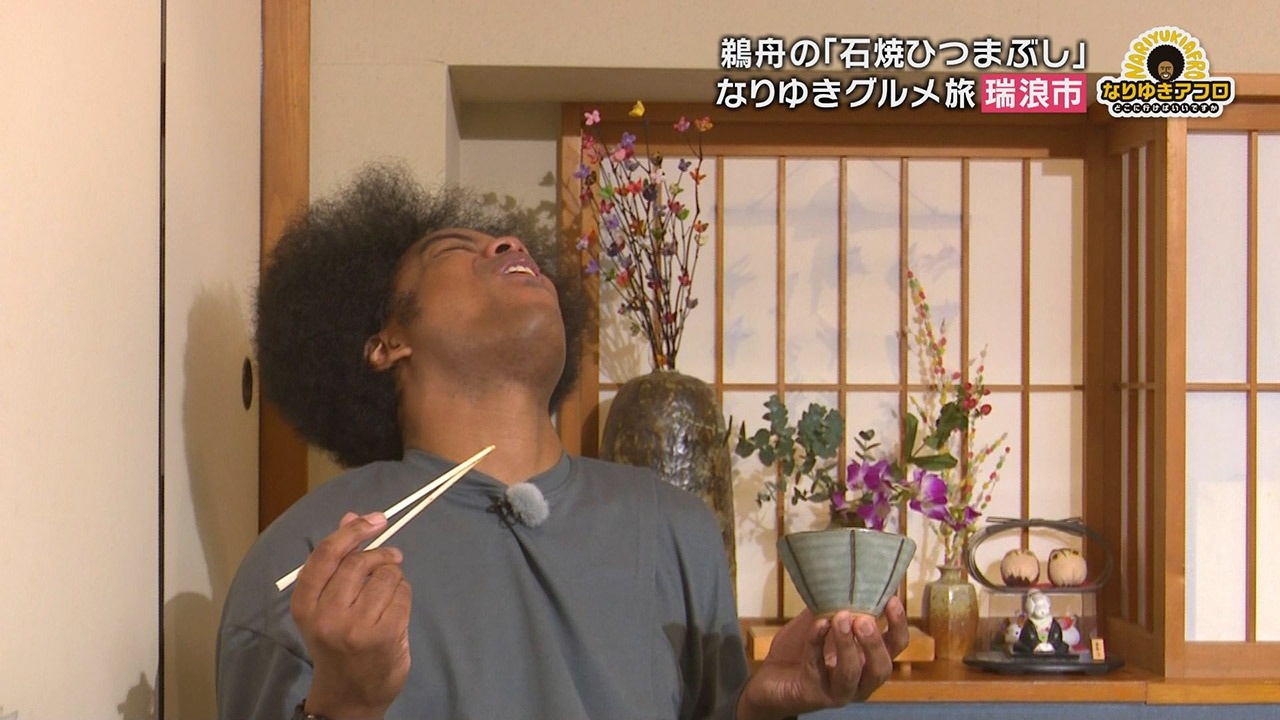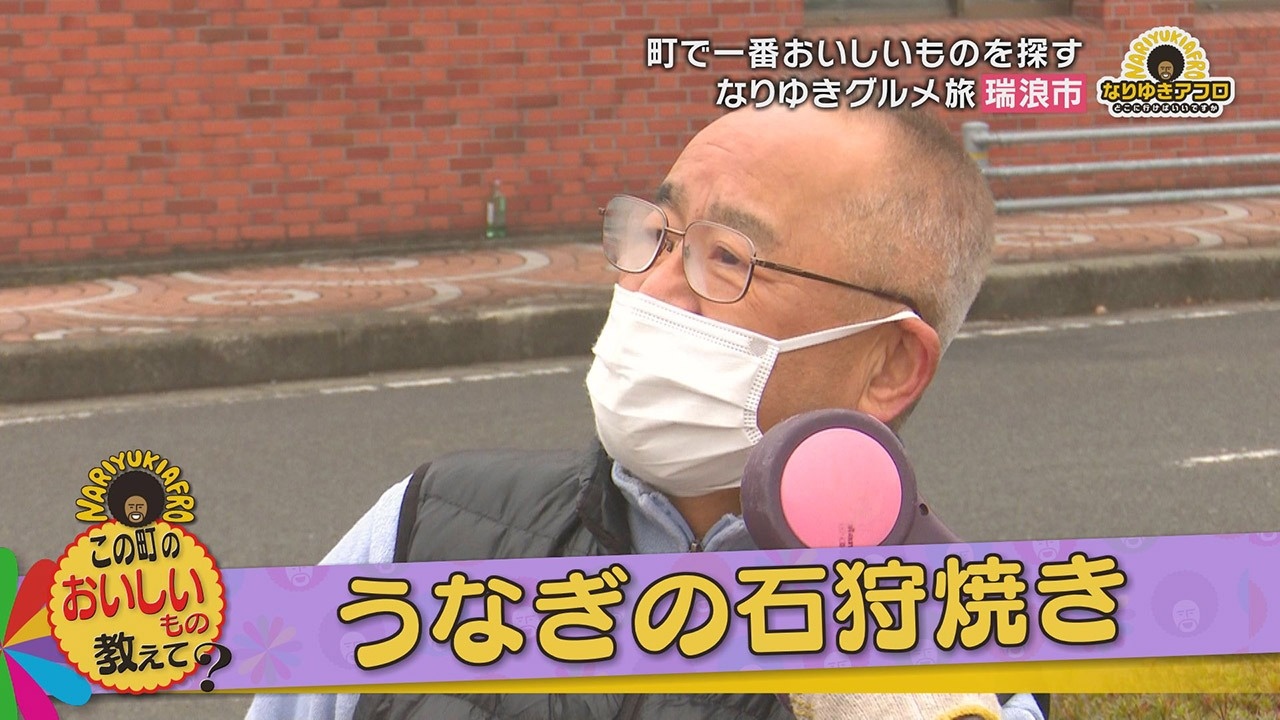 おいしいものを求め、再び町を歩く副島くん。愛犬と散歩中の男性に瑞浪市のおいしいものを聞いたところ『石の器のうなぎ丼みたいなやつ』がオススメとのこと。お気に入りの寿司屋さん(日本料理店)にあるメニューで、石の器が焼いてあるため、ご飯におこげが出来ておいしいのだとか。つまり、石焼ビビンバのうなぎバージョンです。教えてくれたお店に副島くんは向かい、取材もOK!