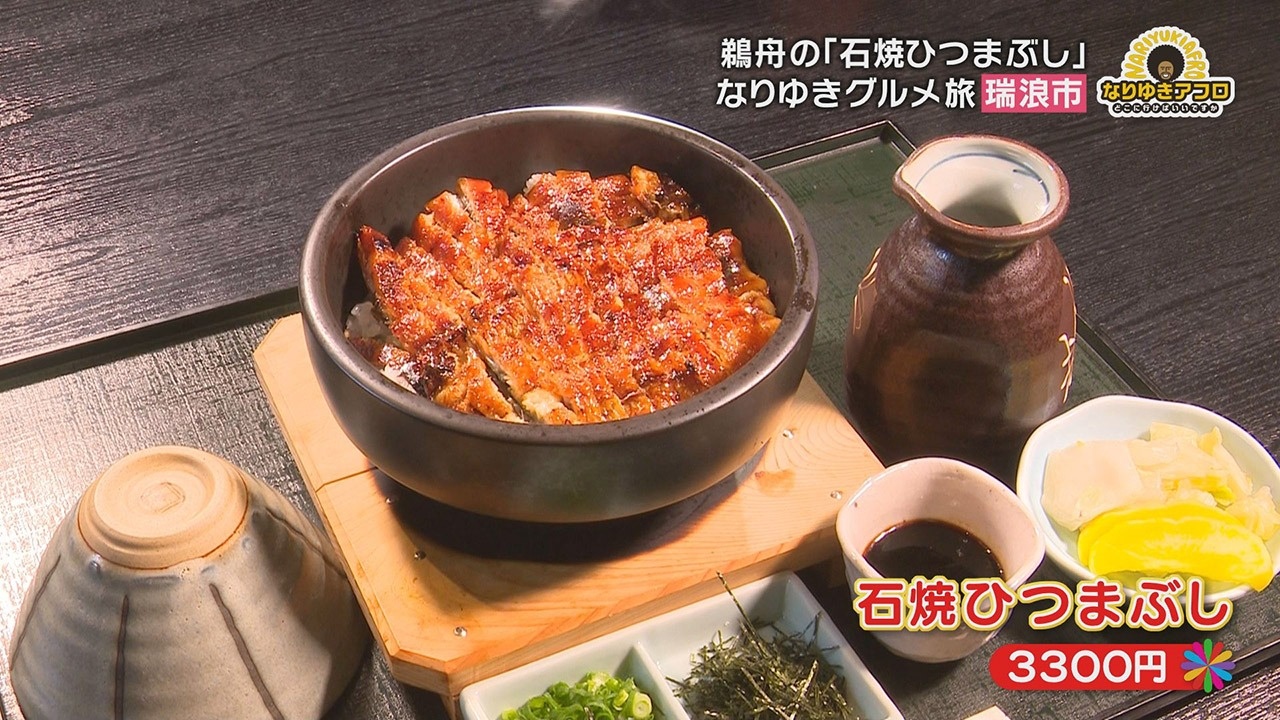 副島くんがおじゃました日本料理店【鵜舟(うぶね)】は創業55年で、現在お店を切り盛りする2代目が20年ほど前に考案したのが『石焼ひつまぶし』(3300円)です。香ばしく焼き上げ、秘伝のタレで仕上げたうなぎをカットし、アツアツに熱した石の器に盛った逸品です。