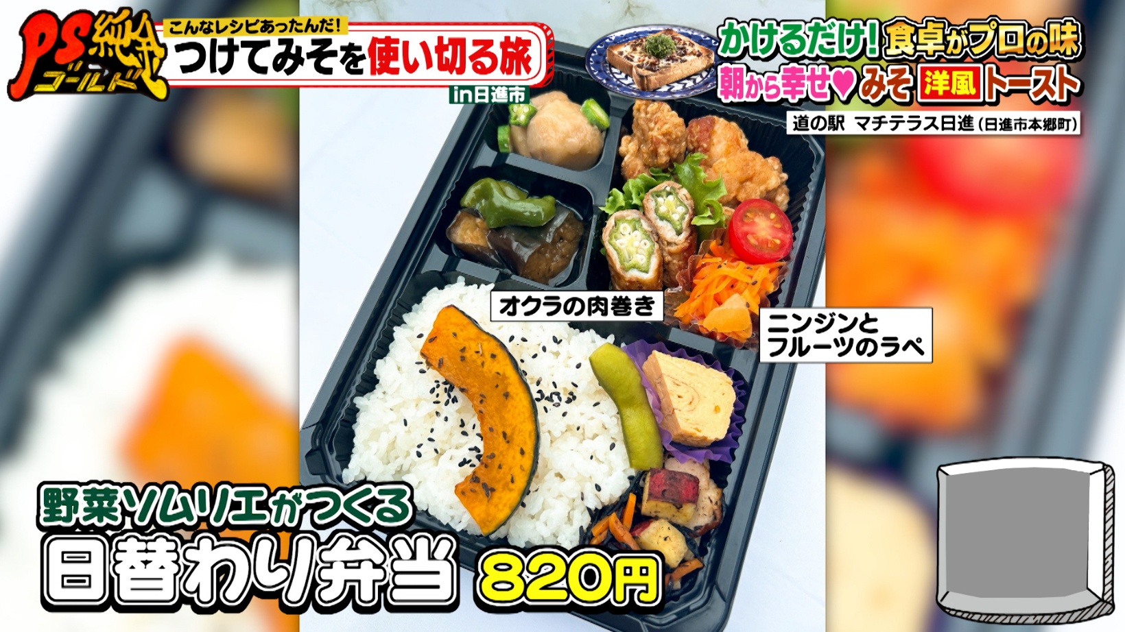 道の駅では、地元の方が作るお弁当やお惣菜も大人気。そこで、「日替わり弁当(820円)」を販売する地元の野菜ソムリエ、森本さんにアレンジみそレシピ「みそカルボトースト」を教わることに。
