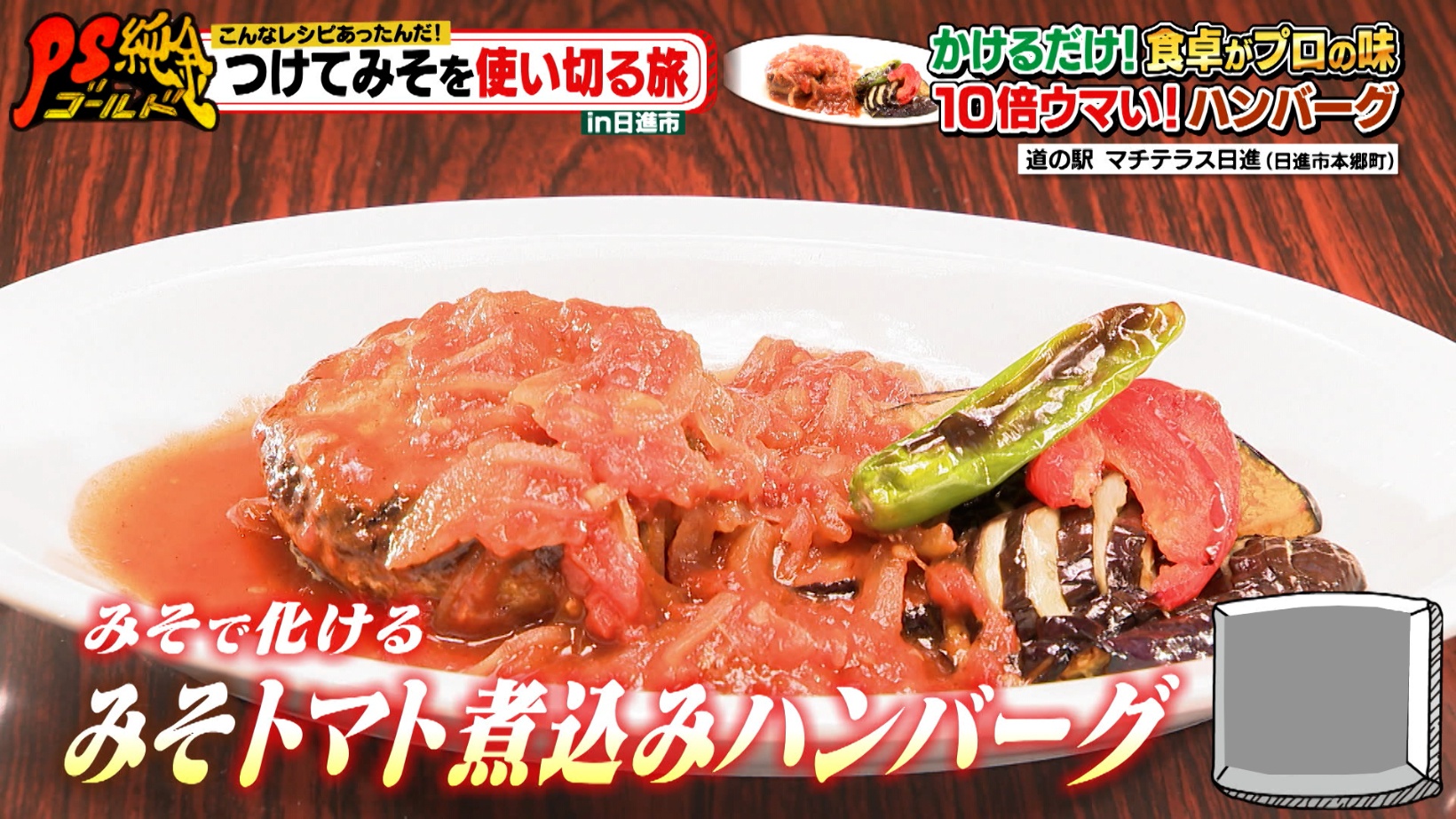 トマトソースで煮込んだハンバーグに「つけてみそかけてみそ」を加えるだけというシンプルで簡単なアレンジ。こちらもスタジオで「(みそを加えたほうが)10倍ウマいのわかる」と絶賛されたのでした。
