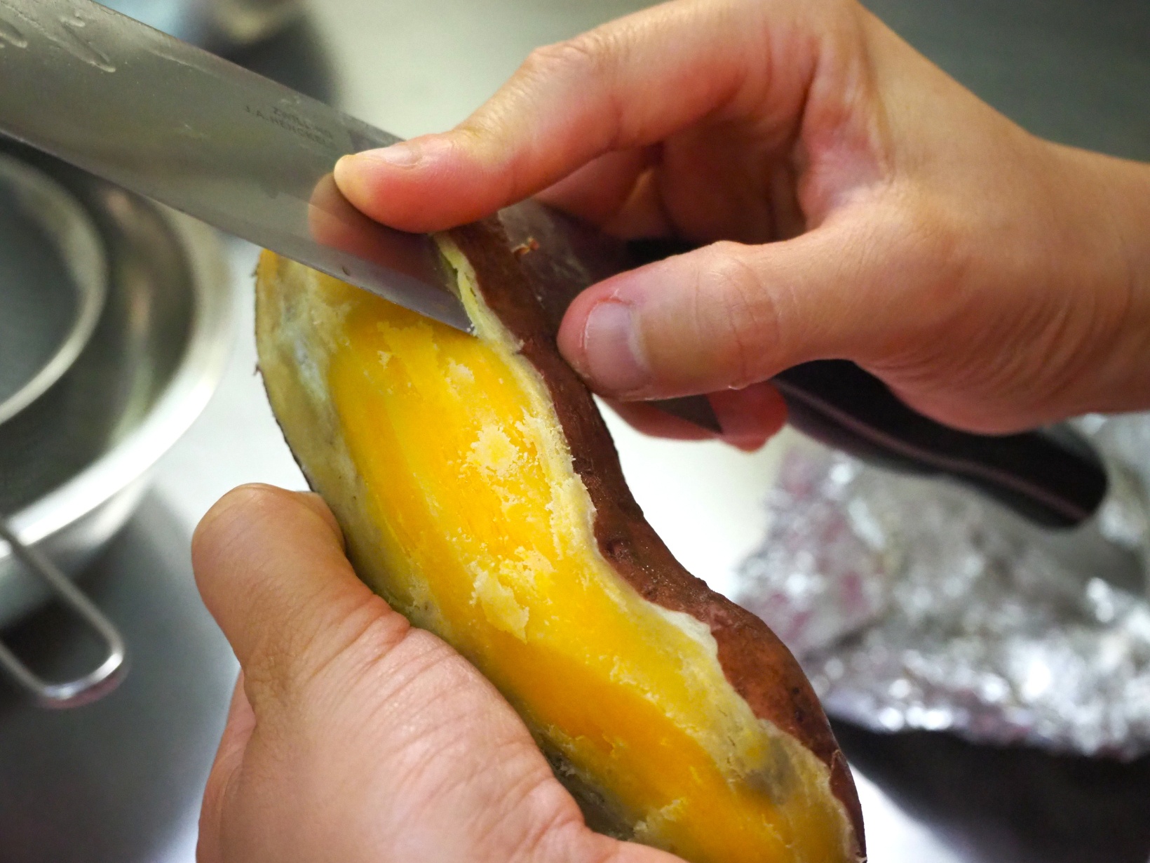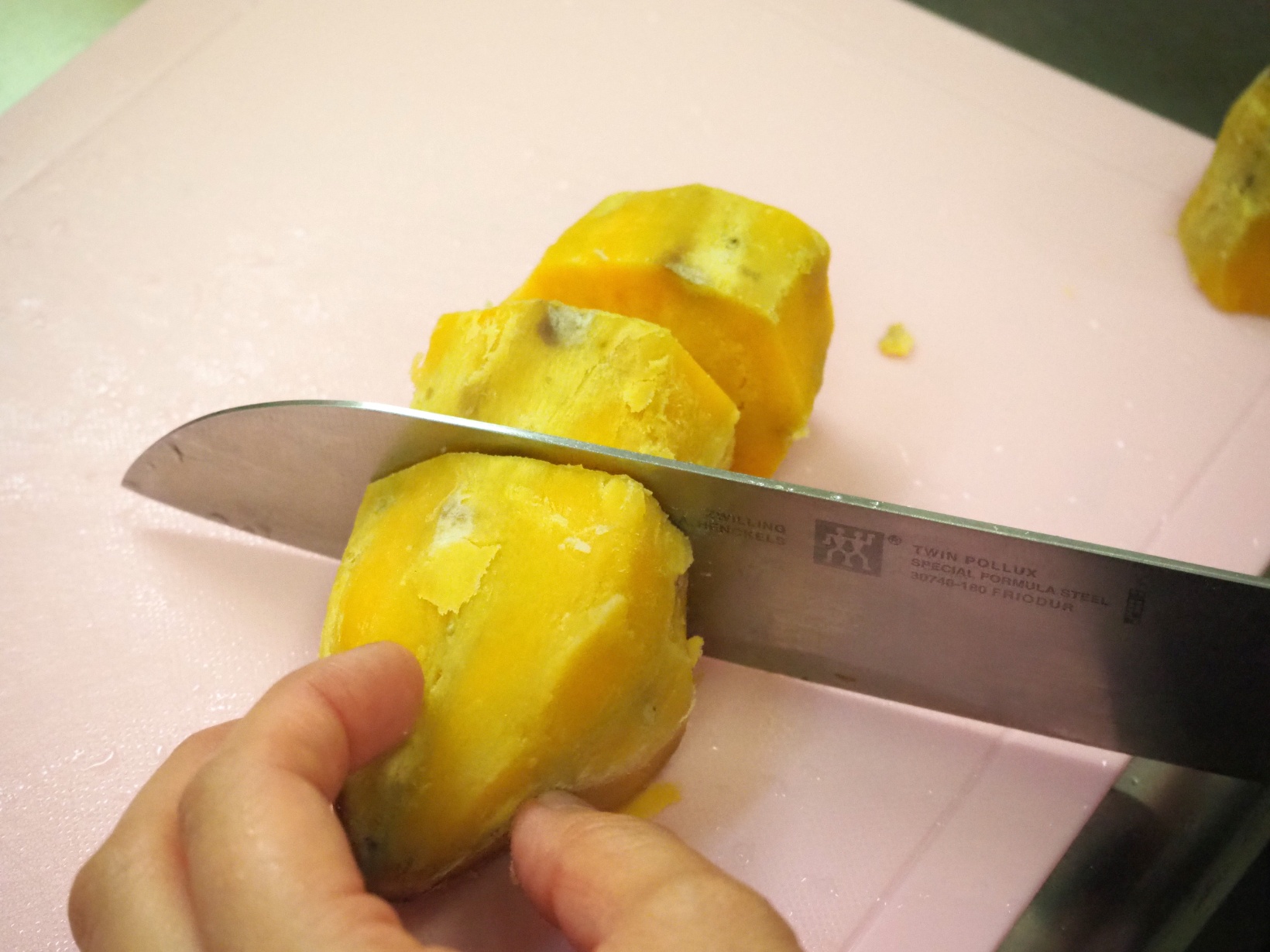 蒸かしたサツマイモの皮をむきます。次の工程でつぶしやすいように、2~3センチくらいにざっくり切っておきます。