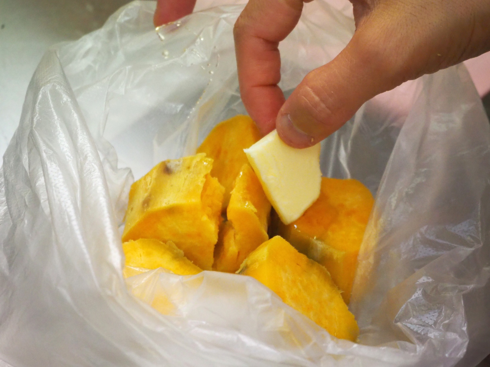 サツマイモをつぶすときに使ったビニール袋を、トレイ替わりに使えば、洗い物もカットできます。