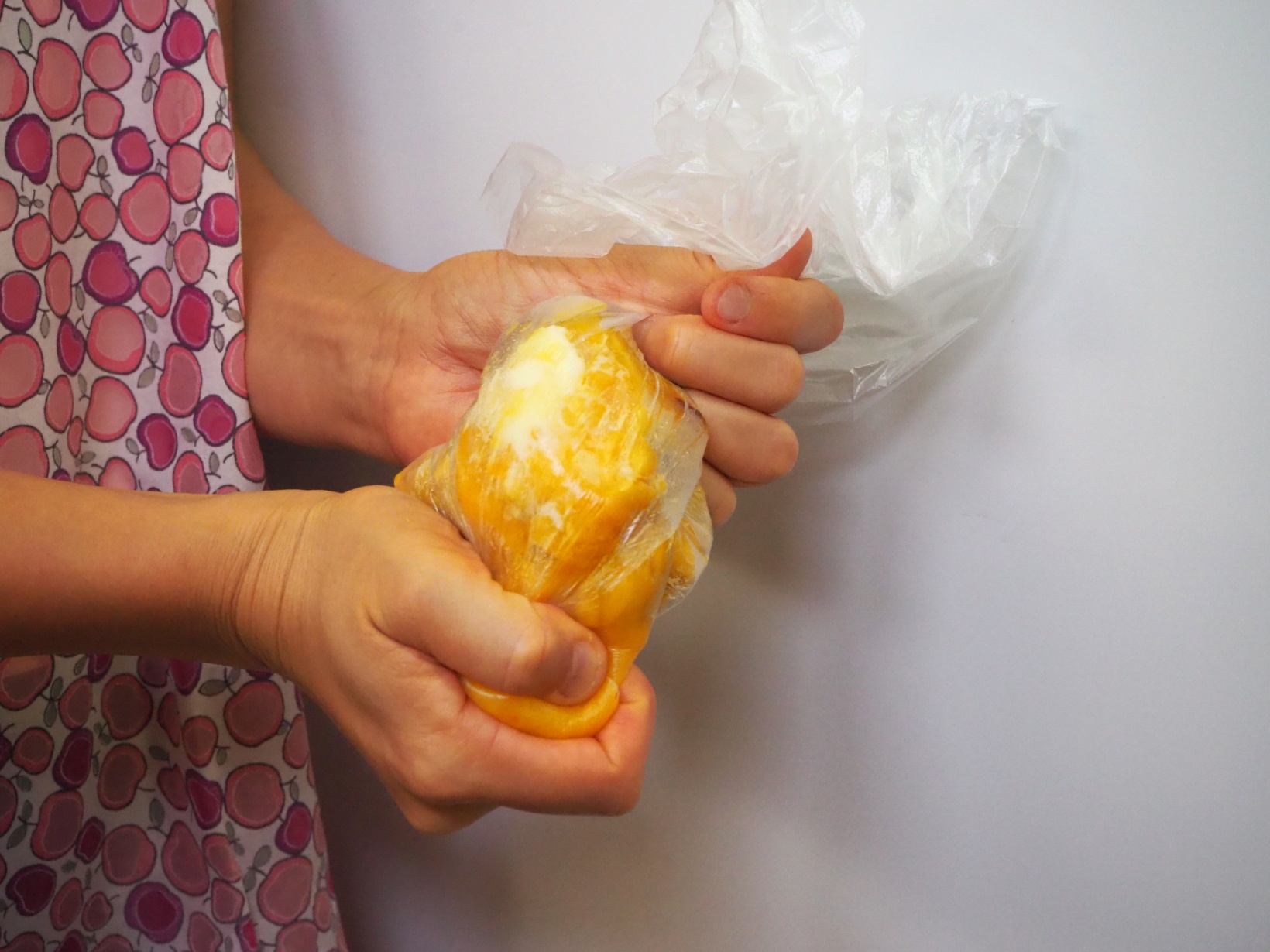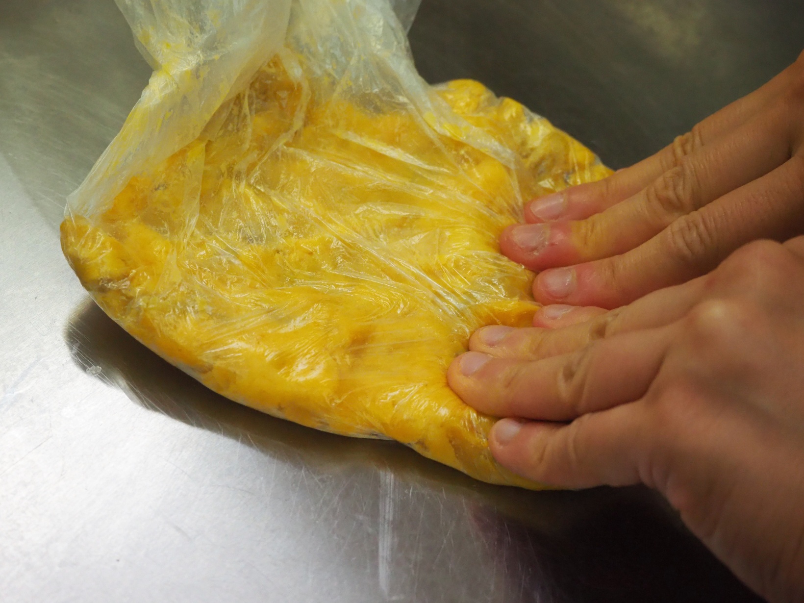 片手でサツマイモを揉むようにつぶしていきます。ある程度つぶれたら、サツマイモが袋から出てこないように注意しながら、指の腹を使ってプレス。“粒感”がなくなってきたらOK!