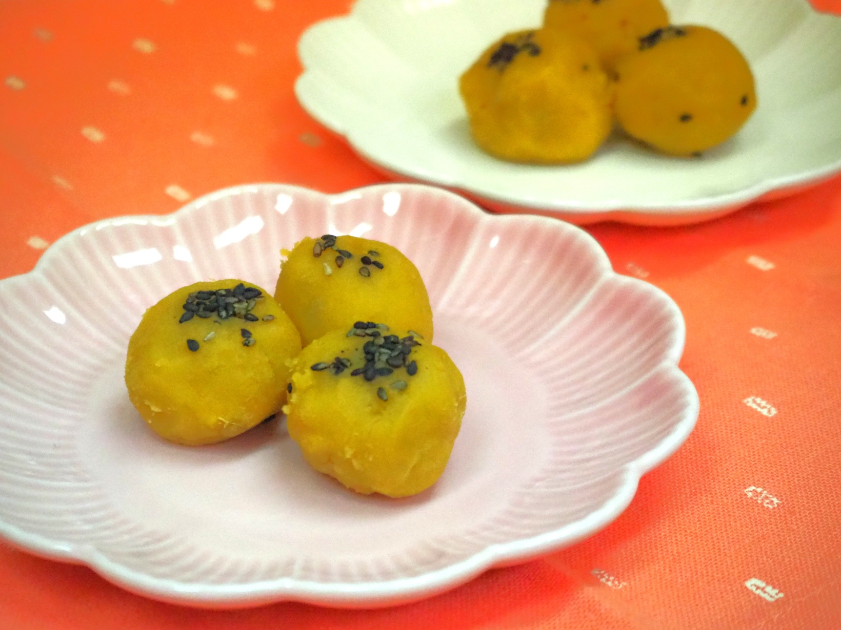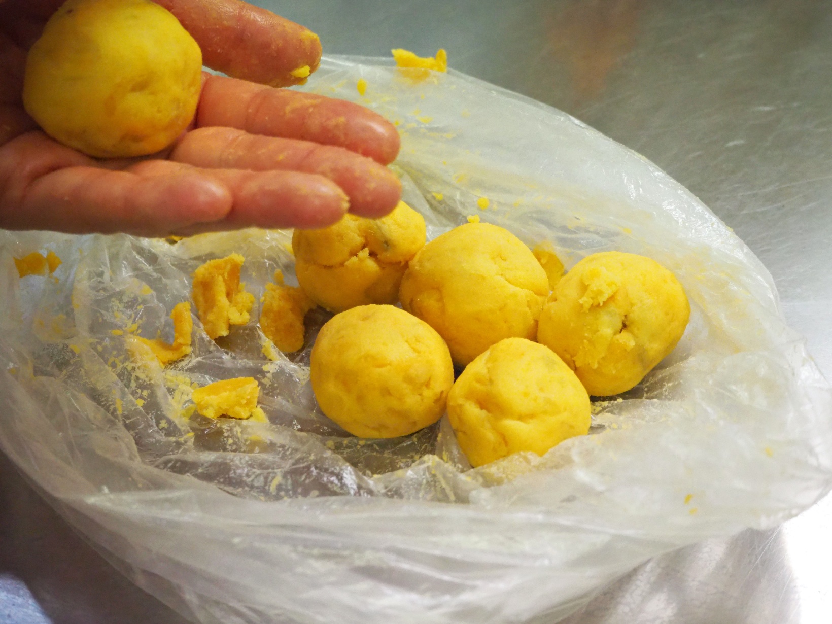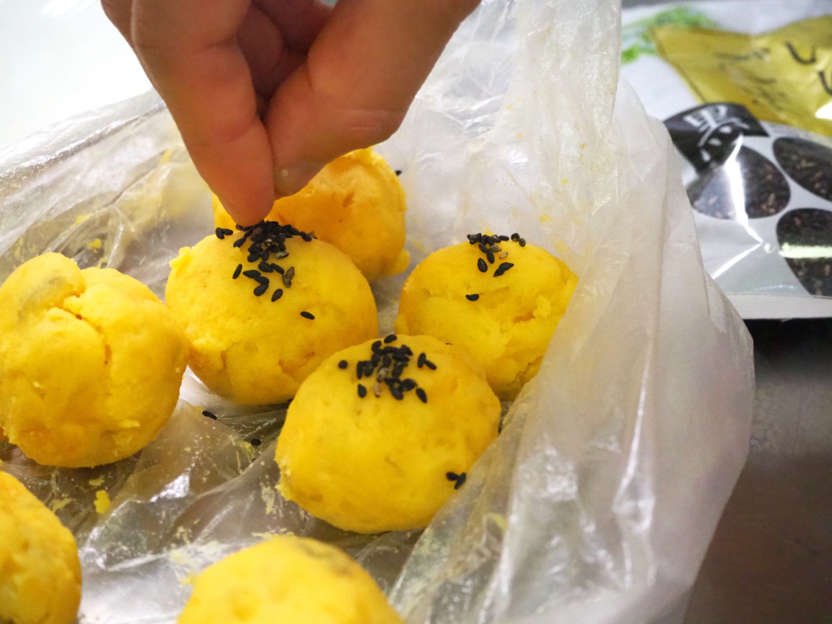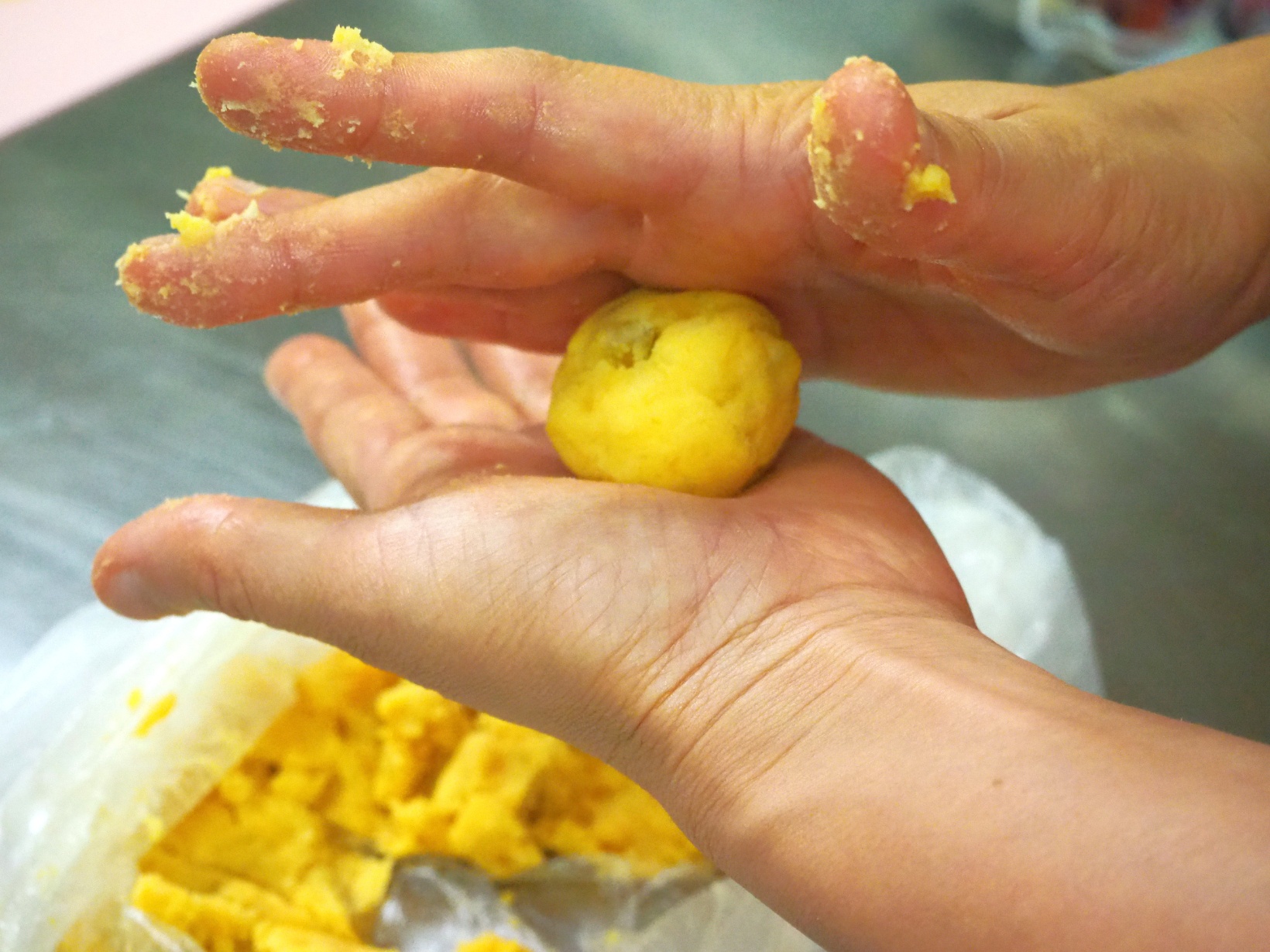 適量を手のひらに取り、丸めていきます。サツマイモは柔らかくなっているので、手のひらで“やさしくコロコロ回す”くらいの力加減を心がけましょう。つぶさないように意識しながら、形を整えていきます。
