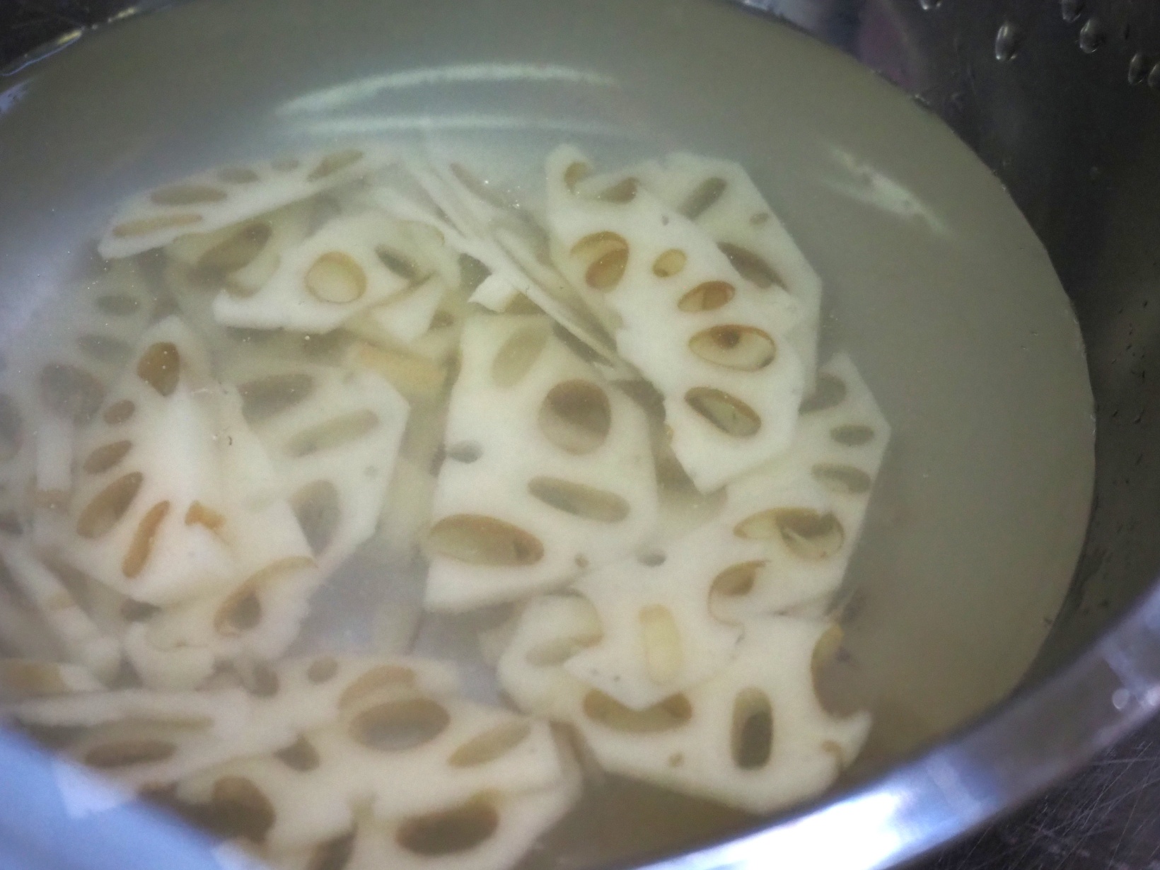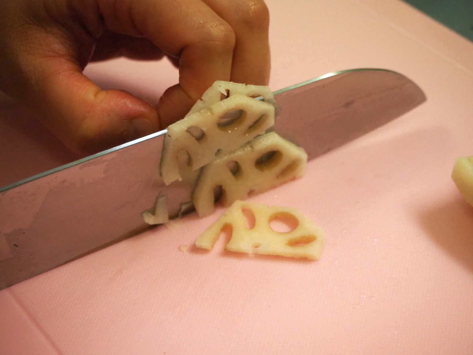 レンコンは、ひと口サイズになるように、縦にカット。0.5センチほどの幅で、イチョウ切りにします。あまり薄切りにしすぎると、“シャキシャキ感”が出なくなってしまうので、注意しましょう。