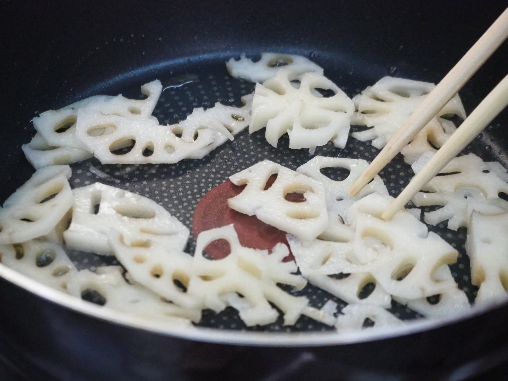 ごま油をひき、中火でレンコンが“きつね色”になるまで炒めます。