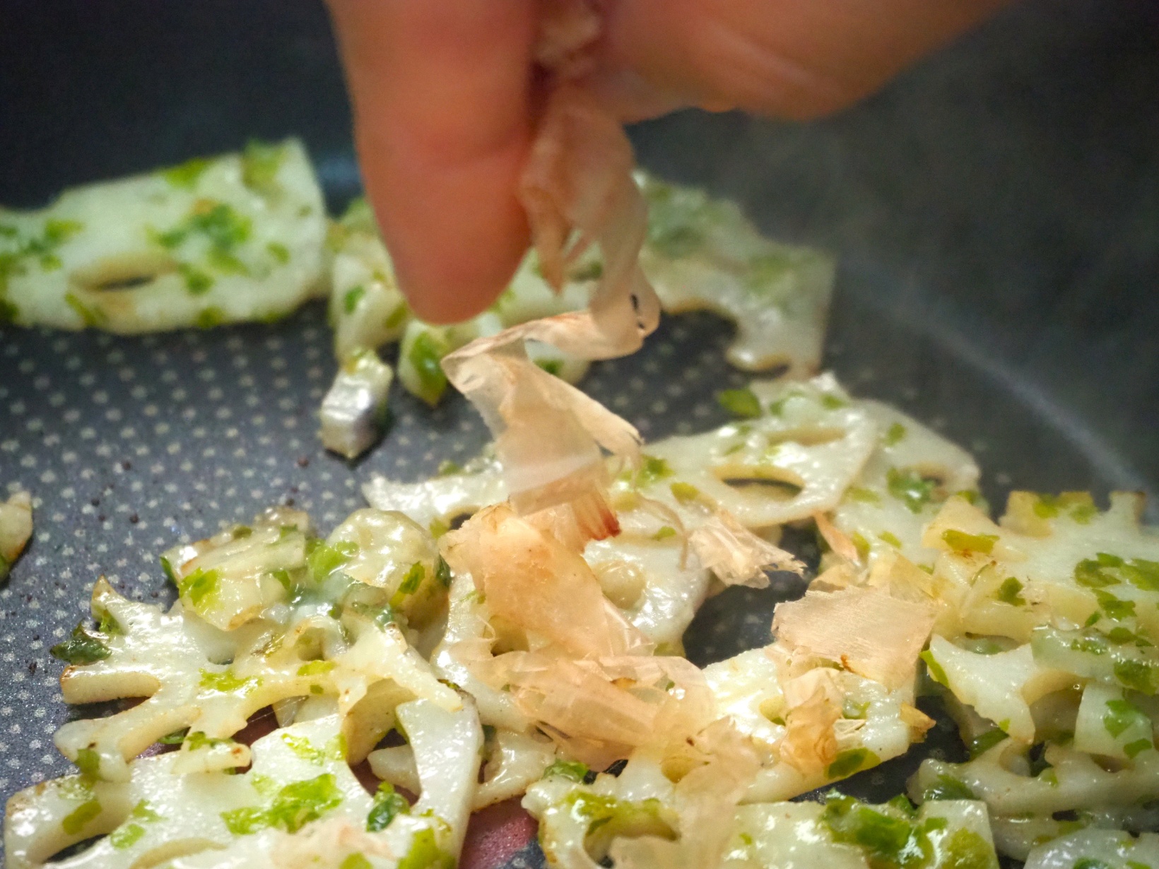 レンコンを炒めたら、青のりと塩麹をイン。最後にかつお節を加えたら、完成です。