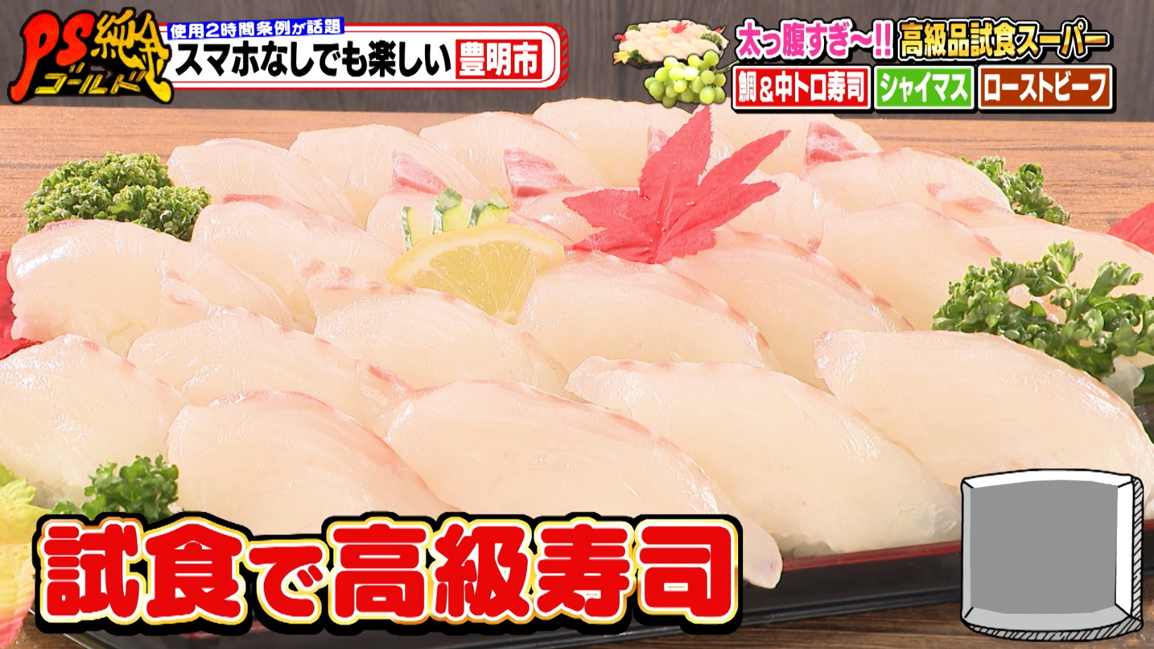 見逃せないのが、ゲリラ的に開催される高級食品の試食タイムです。鯛、中トロなど高級寿司、長野県産シャインマスカット、黒毛和牛ローストビーフなどが試食できます。店内のいたるところで開催されているため、藤森さんたちも大興奮。