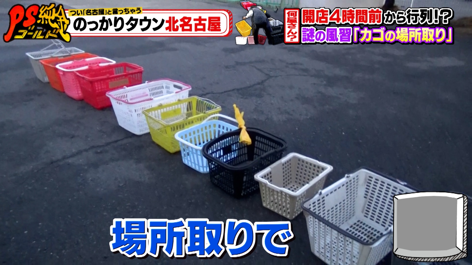北名古屋の謎の風習になっているのが、『世界のフルーツ ハピネスバナナ』前で見られる”カゴの場所取り”。土・日・祝日に加え、「7」がつく日に数量限定で半額となる「房バナナ(250円)」を求めて、順番確保のための買い物カゴが敷地内に並びます。早い日には、開店の約4時間前から行列ができることも。