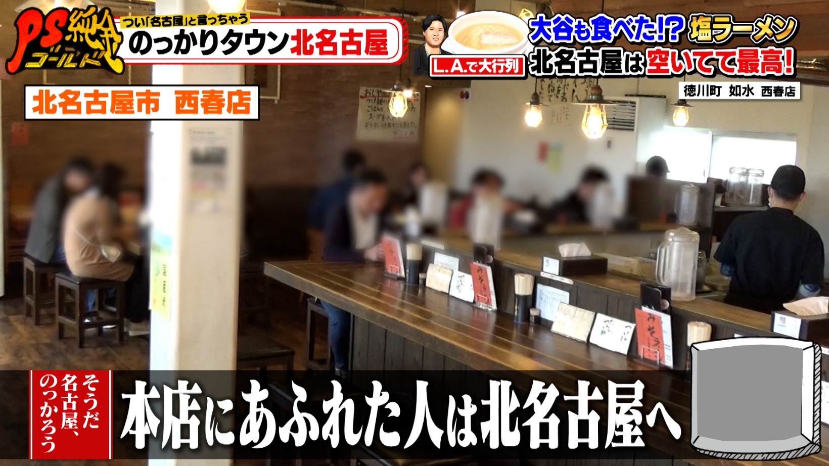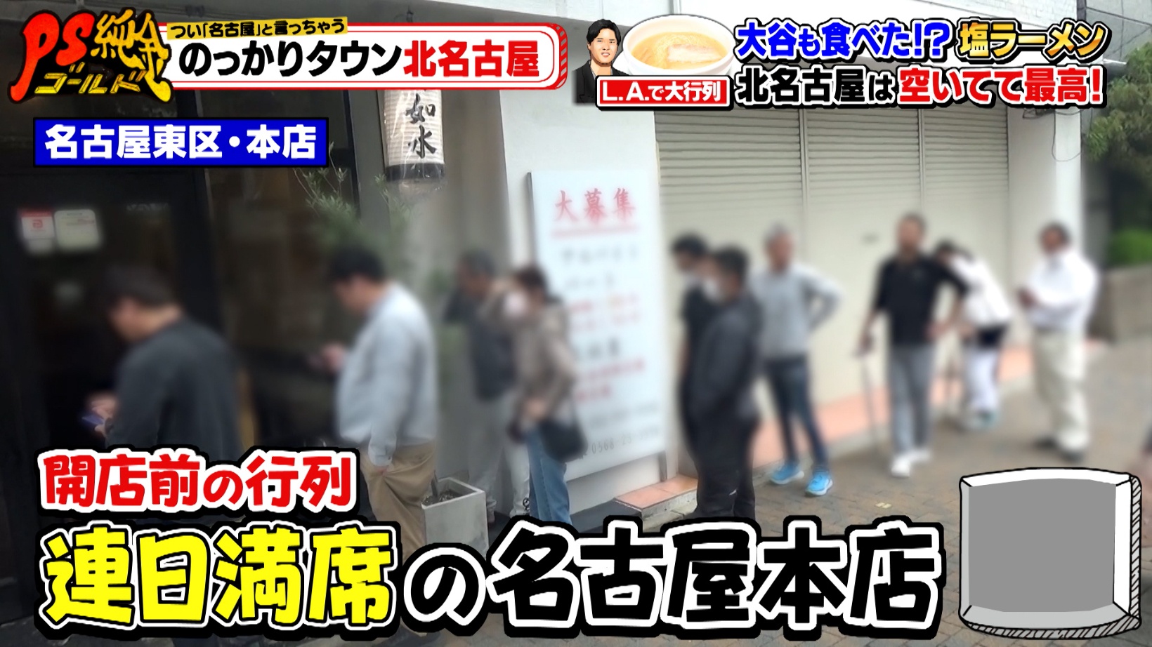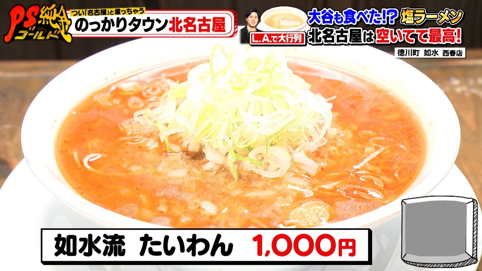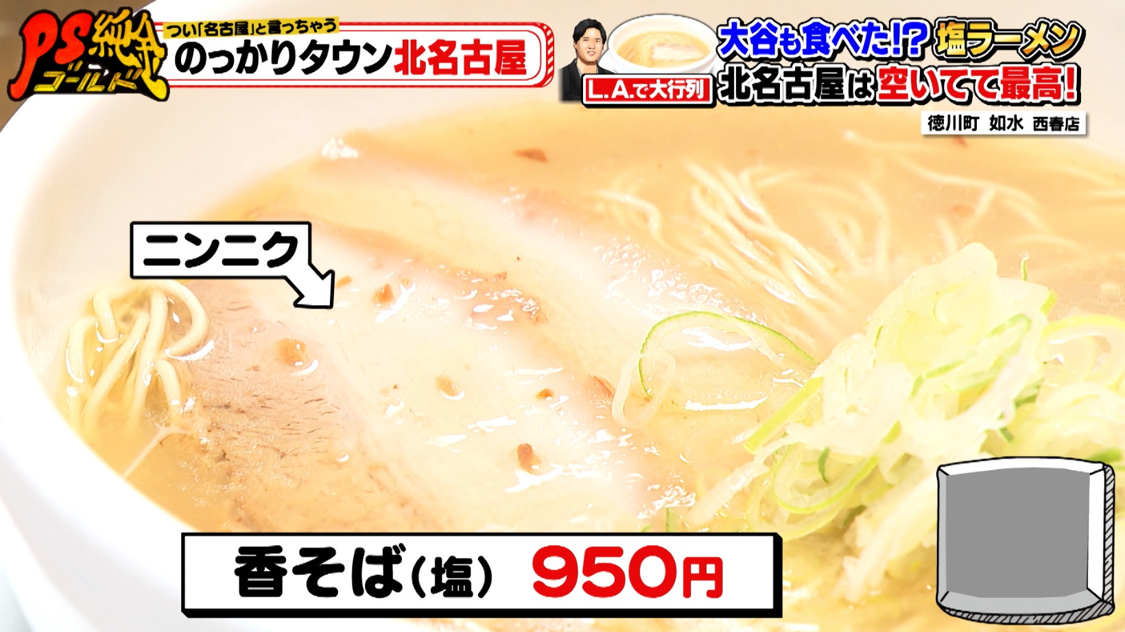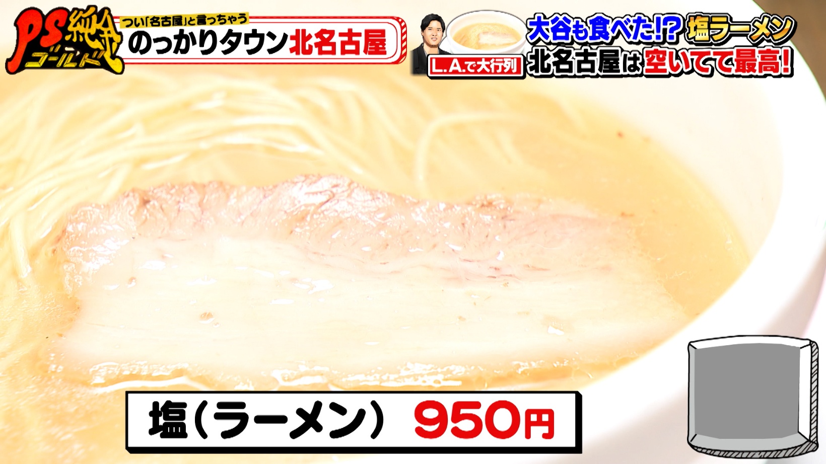 名古屋本店では常に大行列ができる『徳川町 如水』。大谷翔平投手が所属するドジャースの本拠地、米国ロサンゼルスにも支店があり、話題となっています。仕込みに約15時間を要する天然素材約30種類のスープに鶏油と沖縄産塩の塩だれを合わせたスープと、天然かん水を使用した特注の細麺による「塩(ラーメン・950円)」で知られる人気のラーメン専門店です。