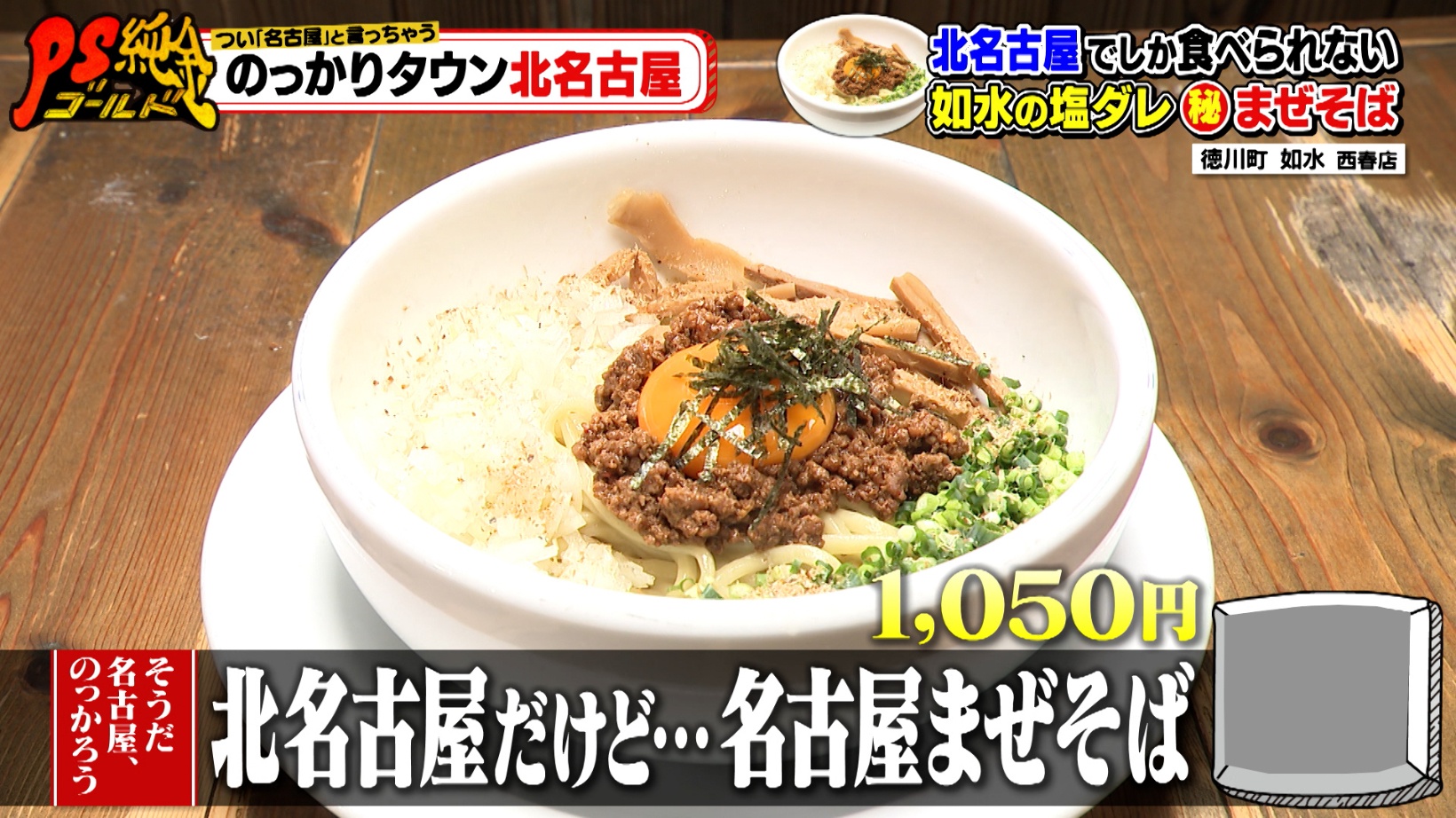 その西春店限定メニューは、まぜそば用太麺に、特製塩だれとニンニク入り香油を合わせ、大量の自家製ミンチとタマネギ、メンマ、ネギをのせた”如水流の台湾まぜそば”。 店長が「本店にはない!」というオリジナルメニューですが、なんとメニュー名は「名古屋まぜそば(1,050円)」。スタジオからは「北名古屋つけてよ」という声があがるのでした。