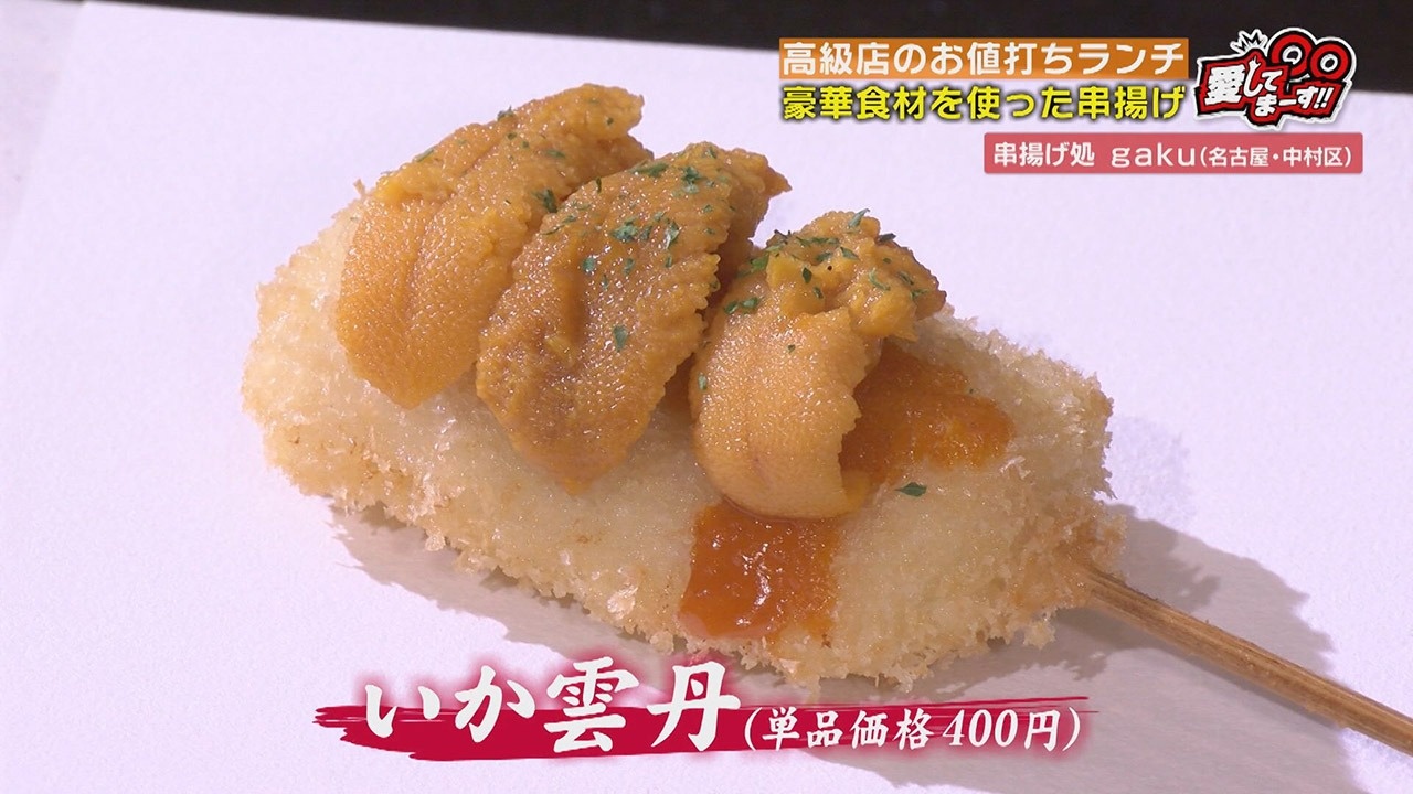 パン屋から仕入れるパン粉を網でこし、極限まで細かくし、それをまとわせた串揚げ。素材の味を活かしつつ、衣の軽さ楽しめるとか。揚げたイカにウニをのせた贅沢な逸品を棚橋さんが味わうと「うまっ!イカのプリプリ感もあるし、ウニの濃厚な感じ。揚げているのにめちゃくちゃあっさりしています」とおいしさを実感。