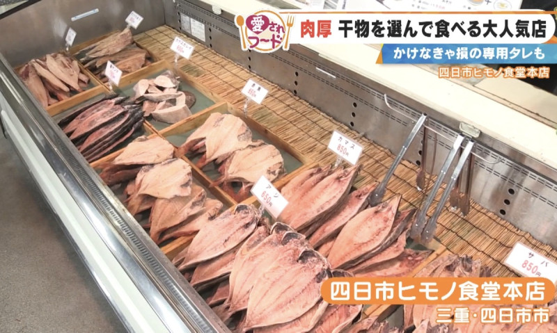 四日市市にある「四日市ヒモノ食堂本店」は、昭和11年創業の老舗水産加工会社の直営店です。店に入ると、シマホッケや高級魚のキンキ、そしてサーモンハラスなど10種類以上の干物がずらりと並びます。どれも肉厚で食べ応えがありそうな逸品ばかり!