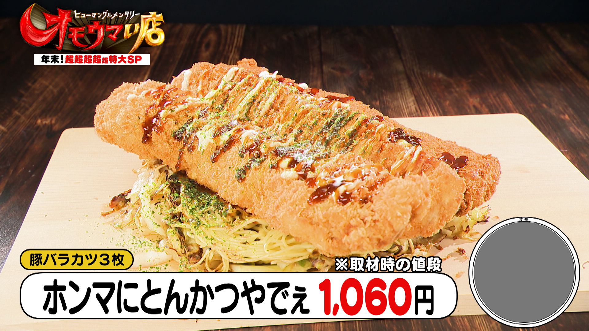 さらに、厚切りの豚バラ肉を2枚重ねにしたトンカツを、なんと3枚ものせた「ホンマにとんかつやでぇ(1,060円)」も登場。豚バラかつの上にお好みソースとマヨネーズをかけ、仕上げに青のりを振りかけます。スタジオでは「2,000円以上」と予想しますが、なんと1,060円という驚きの安さです。