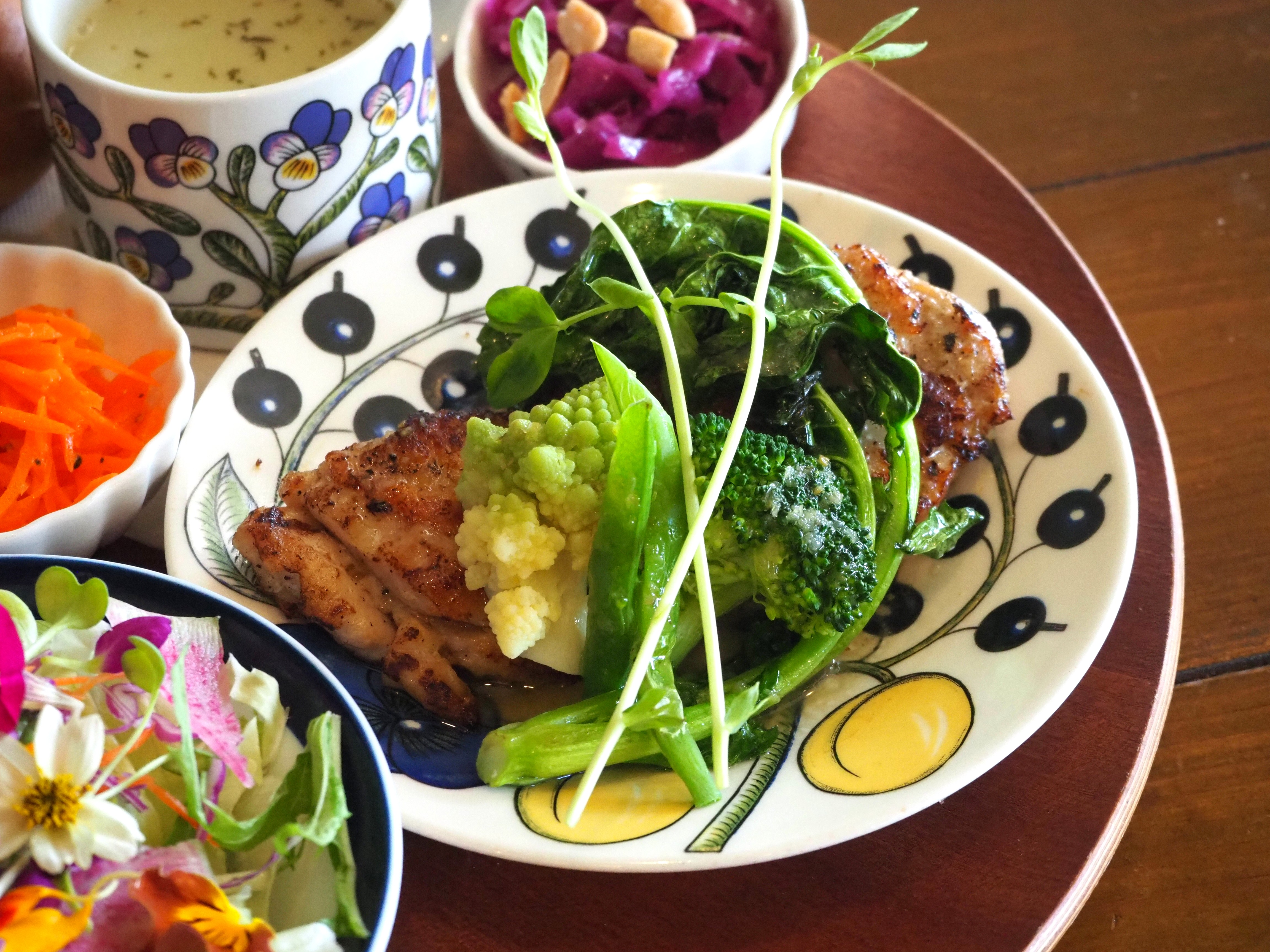この日は、メイン料理に「とりもも肉のソテー ゆずこしょうのソース」をセレクト。鶏肉は事前に漬け込み、当日ジューシーに焼き上げたひと品。野菜をたっぷり使った柚子胡椒のソースは、さっぱりとした口当たりです。