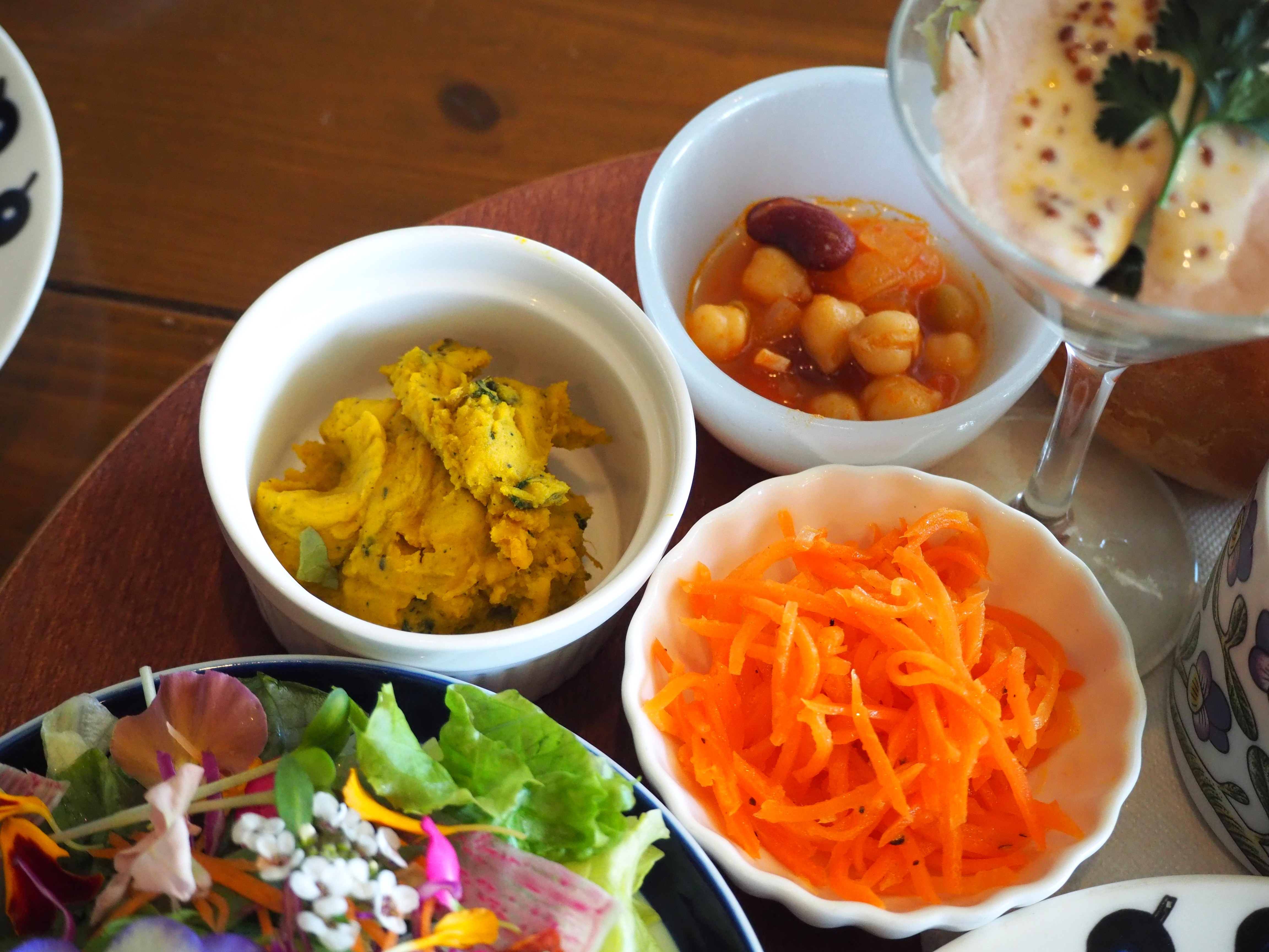 プレートに並ぶのは、彩り豊かな前菜5種。定番は、カボチャのココナッツ煮込み、キャロットラペ、紫キャベツのクミンマリネ、豆のトマト煮込み、ローストポークのハニーマスタードソース。仕入れやその日の気分で、ラインアップが少々変わることもあるといいます。