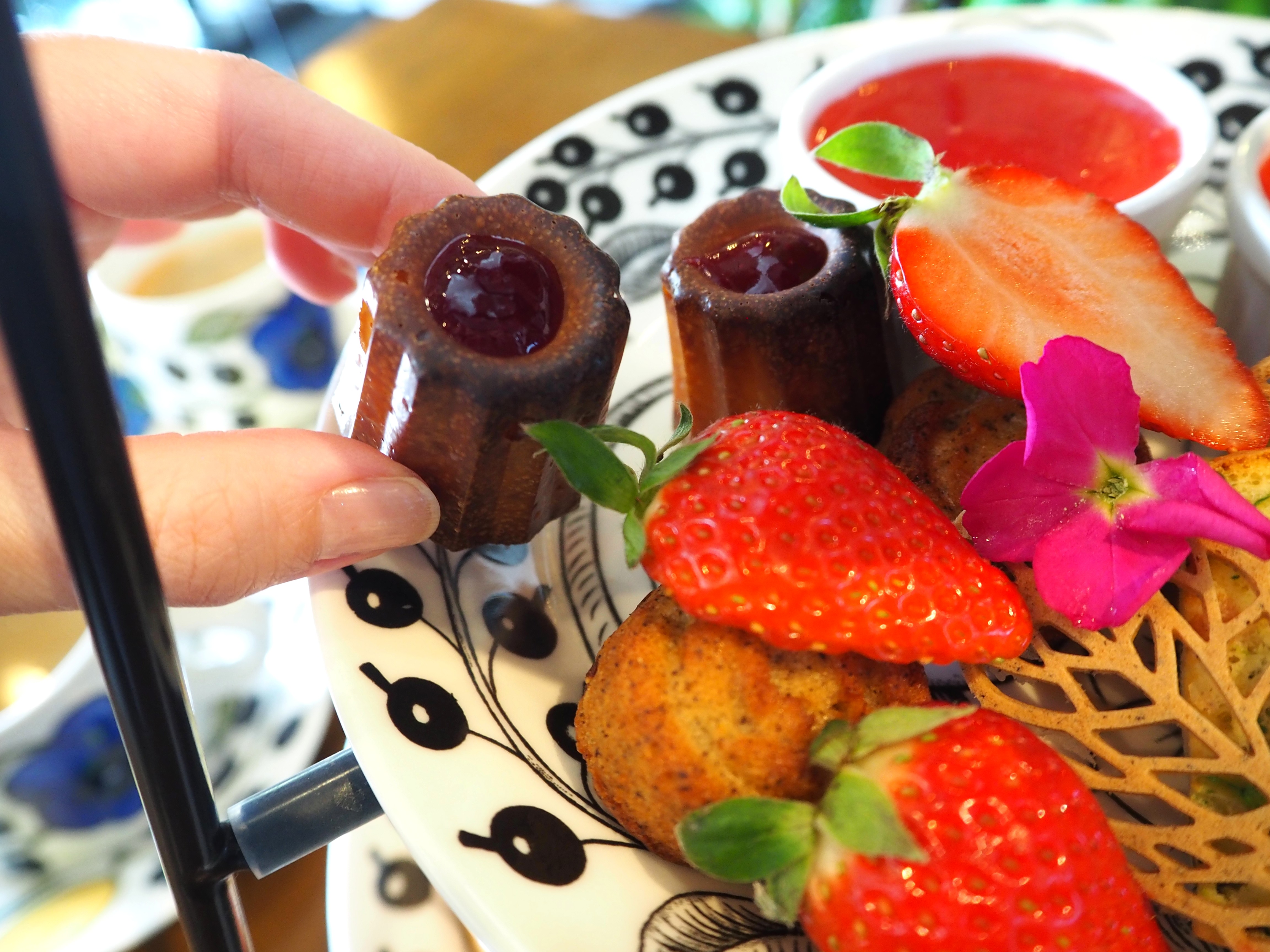 11品ほどのスイーツと軽食が並ぶスタンド。メインのフルーツは季節によって異なり、2026年1月はイチゴが主役(ストロベリーアフターヌーンセット 2,600円)。いちごのシフォンケーキサンドやフランボワーズのカヌレ、アールグレイとフランボワーズのフィナンシェなどさまざまなスイーツが楽しめます。