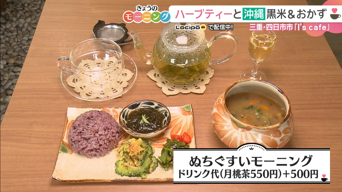 そんなハーブティーにぴったりなのが、「ぬちぐすいモーニング」(ドリンク代+500円)。沖縄の黒米をベースにしたご飯と日替わりのおかず、麹を使った野菜たっぷりの味噌汁がセットになっています。