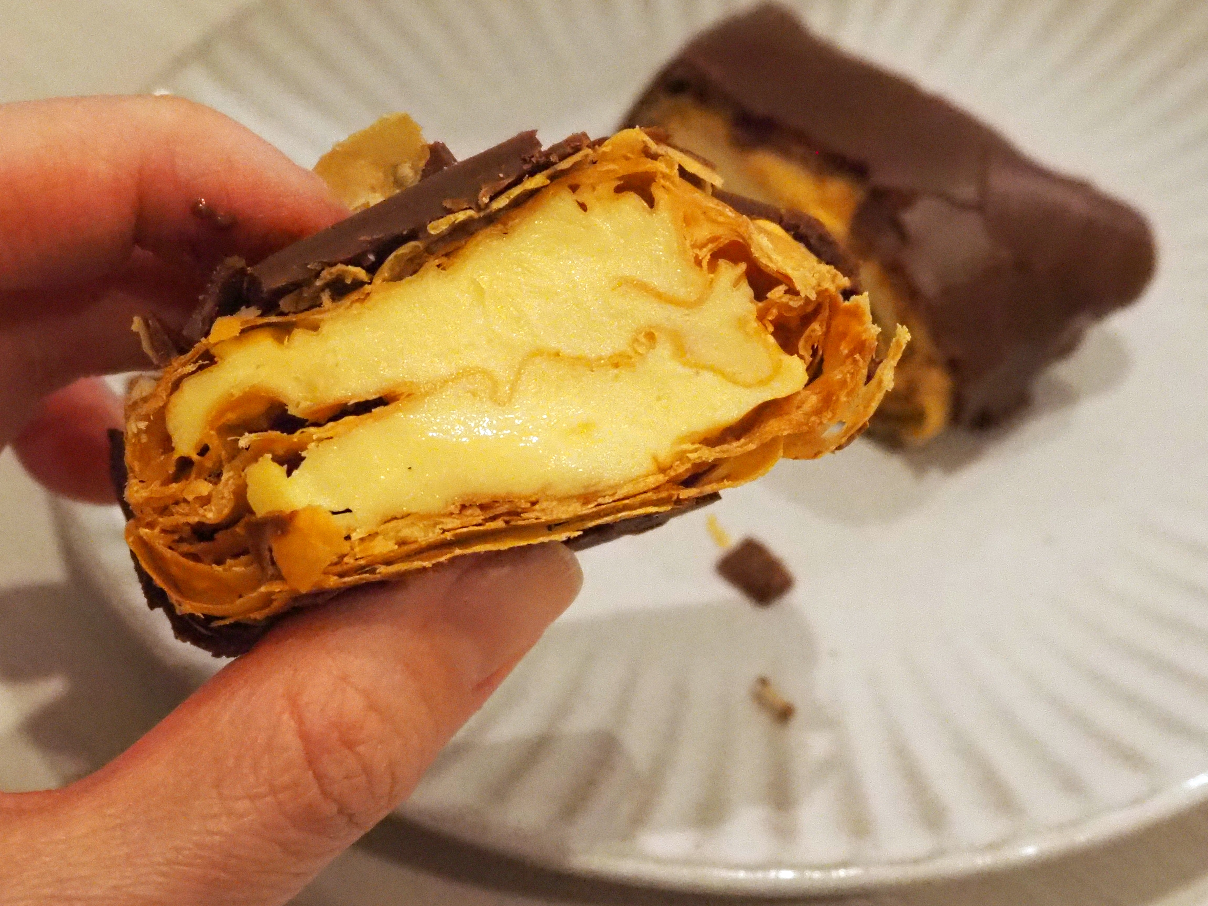 同商品は、パイ生地を何層にも重ねて焼き上げ、中には冬の放牧牛乳を使ったカスタードクリームをたっぷり注入。仕上げにビターなチョコレートをまとわせ、全体を“二度がけ”してコーティング。この手間を惜しまない工程が、リッチな口当たりを支えています。